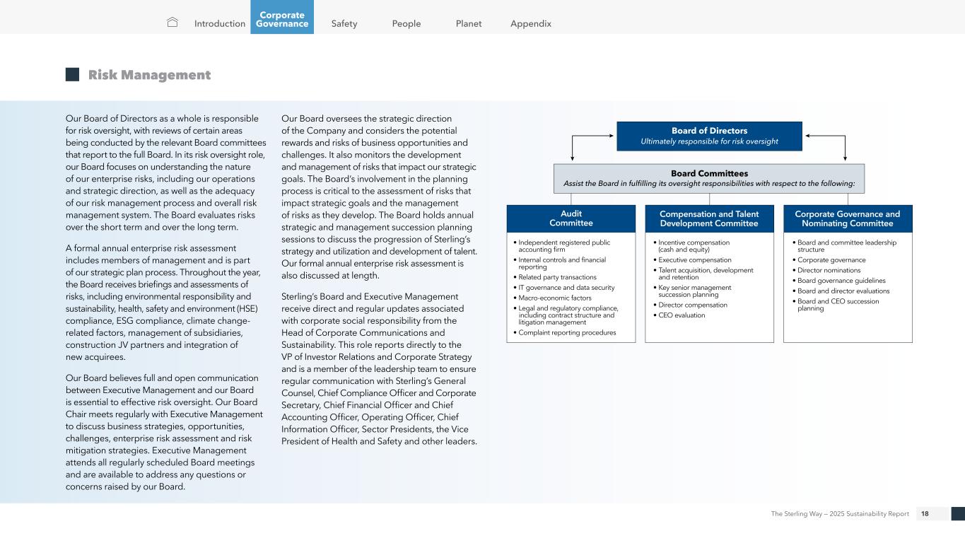 Board of Directors Ultimately responsible for risk oversight Board Committees Assist the Board in fulfilling its oversight responsibilities with respect to the following: Audit Committee Compensation and Talent Development Committee Corporate Governance and Nominating Committee • Independent registered public accounting firm • Internal controls and financial reporting • Related party transactions • IT governance and data security • Macro-economic factors • Legal and regulatory compliance, including contract structure and litigation management • Complaint reporting procedures • Incentive compensation (cash and equity) • Executive compensation • Talent acquisition, development and retention • Key senior management succession planning • Director compensation • CEO evaluation • Board and committee leadership structure • Corporate governance • Director nominations • Board governance guidelines • Board and director evaluations • Board and CEO succession planning The Sterling Way — 2025 Sustainability Report 18 Our Board oversees the strategic direction of the Company and considers the potential rewards and risks of business opportunities and challenges. It also monitors the development and management of risks that impact our strategic goals. The Board’s involvement in the planning process is critical to the assessment of risks that impact strategic goals and the management of risks as they develop. The Board holds annual strategic and management succession planning sessions to discuss the progression of Sterling’s strategy and utilization and development of talent. Our formal annual enterprise risk assessment is also discussed at length. Sterling’s Board and Executive Management receive direct and regular updates associated with corporate social responsibility from the Head of Corporate Communications and Sustainability. This role reports directly to the VP of Investor Relations and Corporate Strategy and is a member of the leadership team to ensure regular communication with Sterling’s General Counsel, Chief Compliance Officer and Corporate Secretary, Chief Financial Officer and Chief Accounting Officer, Operating Officer, Chief Information Officer, Sector Presidents, the Vice President of Health and Safety and other leaders. Our Board of Directors as a whole is responsible for risk oversight, with reviews of certain areas being conducted by the relevant Board committees that report to the full Board. In its risk oversight role, our Board focuses on understanding the nature of our enterprise risks, including our operations and strategic direction, as well as the adequacy of our risk management process and overall risk management system. The Board evaluates risks over the short term and over the long term. A formal annual enterprise risk assessment includes members of management and is part of our strategic plan process. Throughout the year, the Board receives briefings and assessments of risks, including environmental responsibility and sustainability, health, safety and environment (HSE) compliance, ESG compliance, climate change- related factors, management of subsidiaries, construction JV partners and integration of new acquirees. Our Board believes full and open communication between Executive Management and our Board is essential to effective risk oversight. Our Board Chair meets regularly with Executive Management to discuss business strategies, opportunities, challenges, enterprise risk assessment and risk mitigation strategies. Executive Management attends all regularly scheduled Board meetings and are available to address any questions or concerns raised by our Board. Risk Management Introduction Safety Corporate Governance People AppendixPlanet