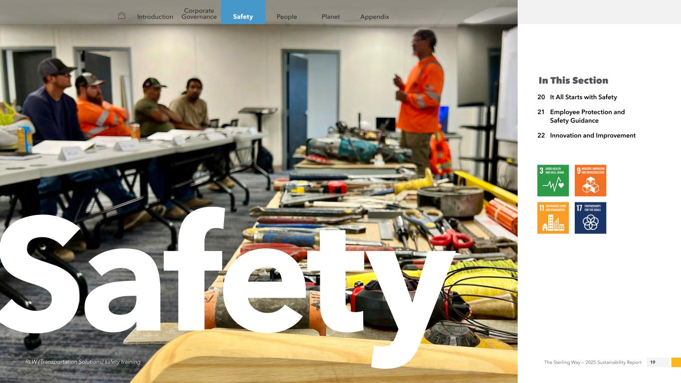 The Sterling Way — 2025 Sustainability Report 19 In This Section 20 It All Starts with Safety 21 Employee Protection and Safety Guidance 22 Innovation and Improvement Safety RLW (Transportation Solutions) safety training Introduction Corporate Governance People Planet AppendixSafety