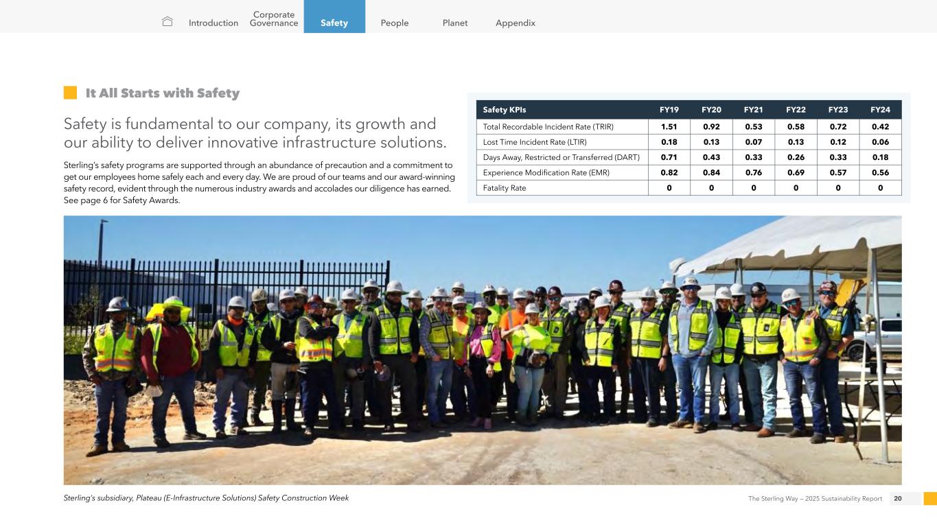 The Sterling Way — 2025 Sustainability Report 20 Safety KPIs FY19 FY20 FY21 FY22 FY23 FY24 Total Recordable Incident Rate (TRIR) 1.51 0.92 0.53 0.58 0.72 0.42 Lost Time Incident Rate (LTIR) 0.18 0.13 0.07 0.13 0.12 0.06 Days Away, Restricted or Transferred (DART) 0.71 0.43 0.33 0.26 0.33 0.18 Experience Modification Rate (EMR) 0.82 0.84 0.76 0.69 0.57 0.56 Fatality Rate 0 0 0 0 0 0 It All Starts with Safety Safety is fundamental to our company, its growth and our ability to deliver innovative infrastructure solutions. Sterling’s safety programs are supported through an abundance of precaution and a commitment to get our employees home safely each and every day. We are proud of our teams and our award-winning safety record, evident through the numerous industry awards and accolades our diligence has earned. See page 6 for Safety Awards. Sterling’s subsidiary, Plateau (E-Infrastructure Solutions) Safety Construction Week Introduction Safety Corporate Governance People AppendixPlanet