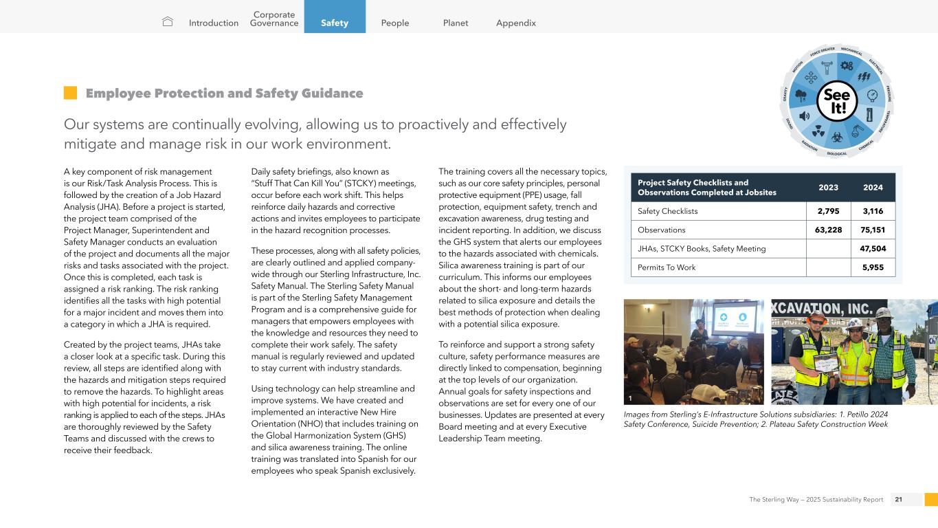 The Sterling Way — 2025 Sustainability Report 21 Employee Protection and Safety Guidance A key component of risk management is our Risk/Task Analysis Process. This is followed by the creation of a Job Hazard Analysis (JHA). Before a project is started, the project team comprised of the Project Manager, Superintendent and Safety Manager conducts an evaluation of the project and documents all the major risks and tasks associated with the project. Once this is completed, each task is assigned a risk ranking. The risk ranking identifies all the tasks with high potential for a major incident and moves them into a category in which a JHA is required. Created by the project teams, JHAs take a closer look at a specific task. During this review, all steps are identified along with the hazards and mitigation steps required to remove the hazards. To highlight areas with high potential for incidents, a risk ranking is applied to each of the steps. JHAs are thoroughly reviewed by the Safety Teams and discussed with the crews to receive their feedback. Daily safety briefings, also known as “Stuff That Can Kill You” (STCKY) meetings, occur before each work shift. This helps reinforce daily hazards and corrective actions and invites employees to participate in the hazard recognition processes. These processes, along with all safety policies, are clearly outlined and applied company- wide through our Sterling Infrastructure, Inc. Safety Manual. The Sterling Safety Manual is part of the Sterling Safety Management Program and is a comprehensive guide for managers that empowers employees with the knowledge and resources they need to complete their work safely. The safety manual is regularly reviewed and updated to stay current with industry standards. Using technology can help streamline and improve systems. We have created and implemented an interactive New Hire Orientation (NHO) that includes training on the Global Harmonization System (GHS) and silica awareness training. The online training was translated into Spanish for our employees who speak Spanish exclusively. The training covers all the necessary topics, such as our core safety principles, personal protective equipment (PPE) usage, fall protection, equipment safety, trench and excavation awareness, drug testing and incident reporting. In addition, we discuss the GHS system that alerts our employees to the hazards associated with chemicals. Silica awareness training is part of our curriculum. This informs our employees about the short- and long-term hazards related to silica exposure and details the best methods of protection when dealing with a potential silica exposure. To reinforce and support a strong safety culture, safety performance measures are directly linked to compensation, beginning at the top levels of our organization. Annual goals for safety inspections and observations are set for every one of our businesses. Updates are presented at every Board meeting and at every Executive Leadership Team meeting. Images from Sterling’s E-Infrastructure Solutions subsidiaries: 1. Petillo 2024 Safety Conference, Suicide Prevention; 2. Plateau Safety Construction Week 1 2 Our systems are continually evolving, allowing us to proactively and effectively mitigate and manage risk in our work environment. Project Safety Checklists and Observations Completed at Jobsites 2023 2024 Safety Checklists 2,795 3,116 Observations 63,228 75,151 JHAs, STCKY Books, Safety Meeting 47,504 Permits To Work 5,955 See It! TEM PER ATU RE PR ESSU R E ELECTRICA L MECHANICAL FORCE GREATER M O TIO N G R A V IT Y SO U N D RADIATION BIOLOGICAL CHEMIC AL Introduction Safety Corporate Governance People AppendixPlanet