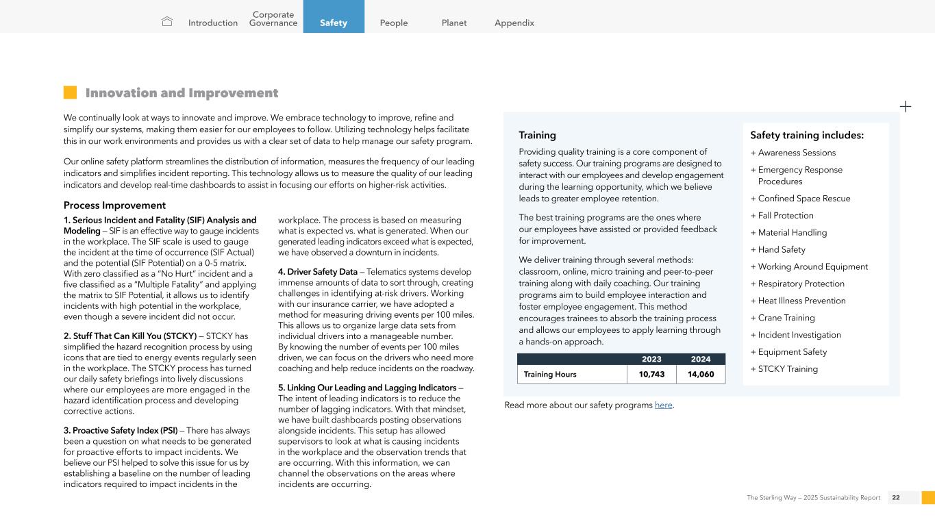 The Sterling Way — 2025 Sustainability Report 22 Innovation and Improvement We continually look at ways to innovate and improve. We embrace technology to improve, refine and simplify our systems, making them easier for our employees to follow. Utilizing technology helps facilitate this in our work environments and provides us with a clear set of data to help manage our safety program. Our online safety platform streamlines the distribution of information, measures the frequency of our leading indicators and simplifies incident reporting. This technology allows us to measure the quality of our leading indicators and develop real-time dashboards to assist in focusing our efforts on higher-risk activities. Process Improvement Safety training includes: + Awareness Sessions + Emergency Response Procedures + Confined Space Rescue + Fall Protection + Material Handling + Hand Safety + Working Around Equipment + Respiratory Protection + Heat Illness Prevention + Crane Training + Incident Investigation + Equipment Safety + STCKY Training 1. Serious Incident and Fatality (SIF) Analysis and Modeling — SIF is an effective way to gauge incidents in the workplace. The SIF scale is used to gauge the incident at the time of occurrence (SIF Actual) and the potential (SIF Potential) on a 0-5 matrix. With zero classified as a “No Hurt” incident and a five classified as a “Multiple Fatality” and applying the matrix to SIF Potential, it allows us to identify incidents with high potential in the workplace, even though a severe incident did not occur. 2. Stuff That Can Kill You (STCKY) — STCKY has simplified the hazard recognition process by using icons that are tied to energy events regularly seen in the workplace. The STCKY process has turned our daily safety briefings into lively discussions where our employees are more engaged in the hazard identification process and developing corrective actions. 3. Proactive Safety Index (PSI) — There has always been a question on what needs to be generated for proactive efforts to impact incidents. We believe our PSI helped to solve this issue for us by establishing a baseline on the number of leading indicators required to impact incidents in the workplace. The process is based on measuring what is expected vs. what is generated. When our generated leading indicators exceed what is expected, we have observed a downturn in incidents. 4. Driver Safety Data — Telematics systems develop immense amounts of data to sort through, creating challenges in identifying at-risk drivers. Working with our insurance carrier, we have adopted a method for measuring driving events per 100 miles. This allows us to organize large data sets from individual drivers into a manageable number. By knowing the number of events per 100 miles driven, we can focus on the drivers who need more coaching and help reduce incidents on the roadway. 5. Linking Our Leading and Lagging Indicators — The intent of leading indicators is to reduce the number of lagging indicators. With that mindset, we have built dashboards posting observations alongside incidents. This setup has allowed supervisors to look at what is causing incidents in the workplace and the observation trends that are occurring. With this information, we can channel the observations on the areas where incidents are occurring. Training Providing quality training is a core component of safety success. Our training programs are designed to interact with our employees and develop engagement during the learning opportunity, which we believe leads to greater employee retention. The best training programs are the ones where our employees have assisted or provided feedback for improvement. We deliver training through several methods: classroom, online, micro training and peer-to-peer training along with daily coaching. Our training programs aim to build employee interaction and foster employee engagement. This method encourages trainees to absorb the training process and allows our employees to apply learning through a hands-on approach. Read more about our safety programs here. 2023 2024 Training Hours 10,743 14,060 Introduction Safety Corporate Governance People AppendixPlanet