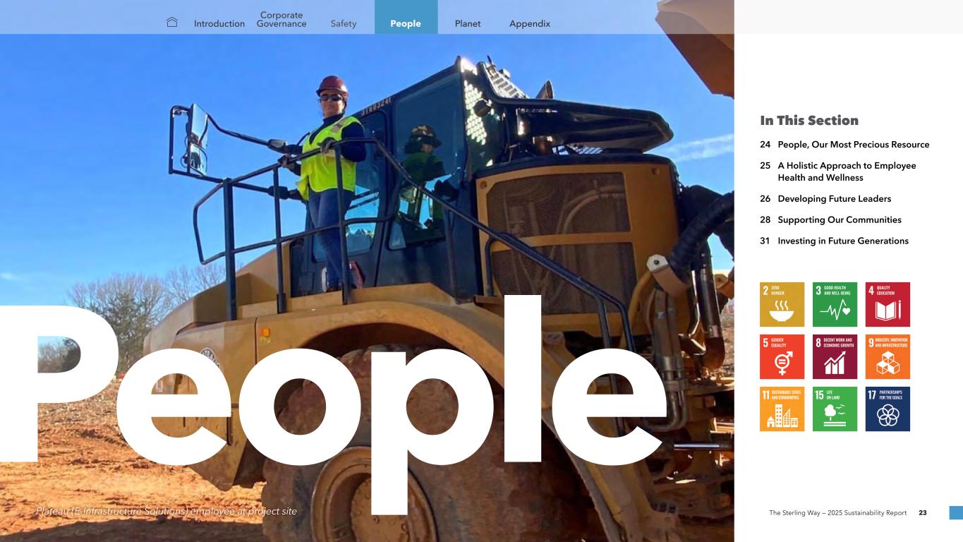 The Sterling Way — 2025 Sustainability Report 23 In This Section 24 People, Our Most Precious Resource 25 A Holistic Approach to Employee Health and Wellness 26 Developing Future Leaders 28 Supporting Our Communities 31 Investing in Future Generations Plateau (E-Infrastructure Solutions) employee at project site Introduction Safety Corporate Governance People AppendixPlanet