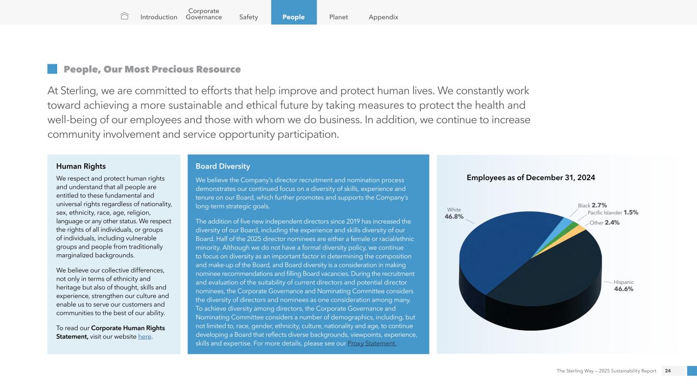 Hispanic 46.6% White 46.8% Black 2.7% Pacific Islander 1.5% Other 2.4% Employees as of December 31, 2024 The Sterling Way — 2025 Sustainability Report 24 People, Our Most Precious Resource At Sterling, we are committed to efforts that help improve and protect human lives. We constantly work toward achieving a more sustainable and ethical future by taking measures to protect the health and well-being of our employees and those with whom we do business. In addition, we continue to increase community involvement and service opportunity participation. Human Rights We respect and protect human rights and understand that all people are entitled to these fundamental and universal rights regardless of nationality, sex, ethnicity, race, age, religion, language or any other status. We respect the rights of all individuals, or groups of individuals, including vulnerable groups and people from traditionally marginalized backgrounds. We believe our collective differences, not only in terms of ethnicity and heritage but also of thought, skills and experience, strengthen our culture and enable us to serve our customers and communities to the best of our ability. To read our Corporate Human Rights Statement, visit our website here. Board Diversity We believe the Company’s director recruitment and nomination process demonstrates our continued focus on a diversity of skills, experience and tenure on our Board, which further promotes and supports the Company’s long-term strategic goals. The addition of five new independent directors since 2019 has increased the diversity of our Board, including the experience and skills diversity of our Board. Half of the 2025 director nominees are either a female or racial/ethnic minority. Although we do not have a formal diversity policy, we continue to focus on diversity as an important factor in determining the composition and make-up of the Board, and Board diversity is a consideration in making nominee recommendations and filling Board vacancies. During the recruitment and evaluation of the suitability of current directors and potential director nominees, the Corporate Governance and Nominating Committee considers the diversity of directors and nominees as one consideration among many. To achieve diversity among directors, the Corporate Governance and Nominating Committee considers a number of demographics, including, but not limited to, race, gender, ethnicity, culture, nationality and age, to continue developing a Board that reflects diverse backgrounds, viewpoints, experience, skills and expertise. For more details, please see our Proxy Statement. Introduction Safety Corporate Governance People AppendixPlanet
