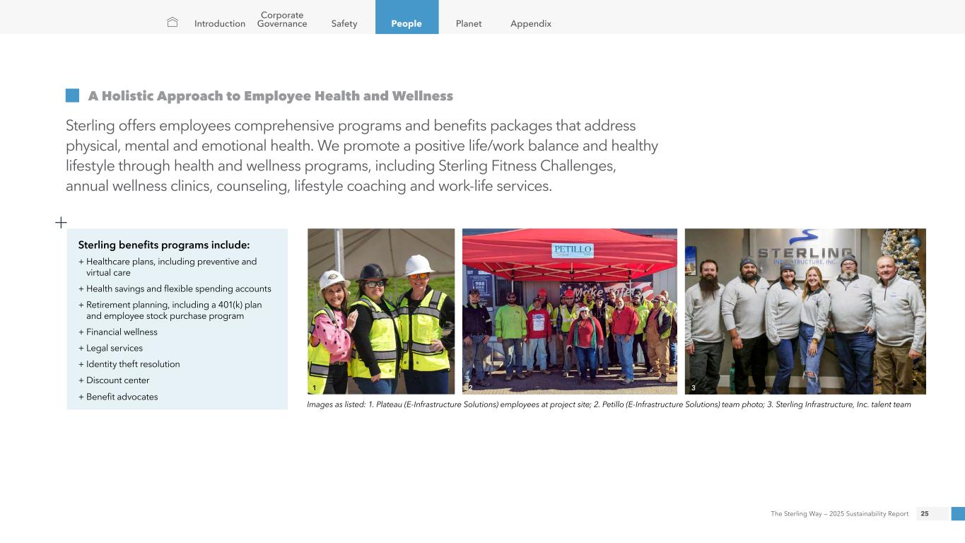 The Sterling Way — 2025 Sustainability Report 25 A Holistic Approach to Employee Health and Wellness Sterling offers employees comprehensive programs and benefits packages that address physical, mental and emotional health. We promote a positive life/work balance and healthy lifestyle through health and wellness programs, including Sterling Fitness Challenges, annual wellness clinics, counseling, lifestyle coaching and work-life services. Images as listed: 1. Plateau (E-Infrastructure Solutions) employees at project site; 2. Petillo (E-Infrastructure Solutions) team photo; 3. Sterling Infrastructure, Inc. talent team 1 2 3 Sterling benefits programs include: + Healthcare plans, including preventive and virtual care + Health savings and flexible spending accounts + Retirement planning, including a 401(k) plan and employee stock purchase program + Financial wellness + Legal services + Identity theft resolution + Discount center + Benefit advocates Introduction Safety Corporate Governance People AppendixPlanet