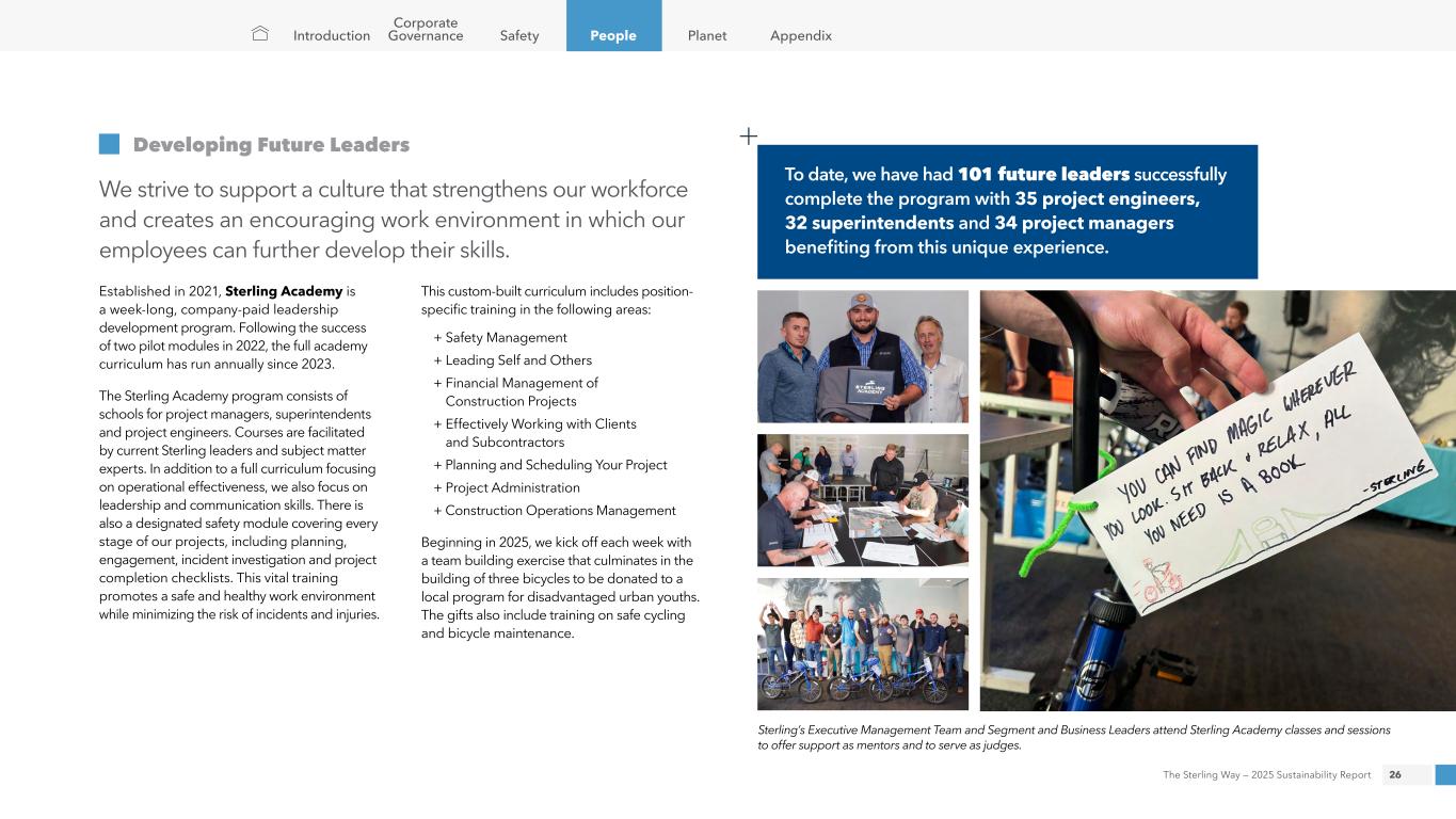 The Sterling Way — 2025 Sustainability Report 26 Developing Future Leaders We strive to support a culture that strengthens our workforce and creates an encouraging work environment in which our employees can further develop their skills. Established in 2021, Sterling Academy is a week-long, company-paid leadership development program. Following the success of two pilot modules in 2022, the full academy curriculum has run annually since 2023. The Sterling Academy program consists of schools for project managers, superintendents and project engineers. Courses are facilitated by current Sterling leaders and subject matter experts. In addition to a full curriculum focusing on operational effectiveness, we also focus on leadership and communication skills. There is also a designated safety module covering every stage of our projects, including planning, engagement, incident investigation and project completion checklists. This vital training promotes a safe and healthy work environment while minimizing the risk of incidents and injuries. This custom-built curriculum includes position- specific training in the following areas: + Safety Management + Leading Self and Others + Financial Management of Construction Projects + Effectively Working with Clients and Subcontractors + Planning and Scheduling Your Project + Project Administration + Construction Operations Management Beginning in 2025, we kick off each week with a team building exercise that culminates in the building of three bicycles to be donated to a local program for disadvantaged urban youths. The gifts also include training on safe cycling and bicycle maintenance. To date, we have had 101 future leaders successfully complete the program with 35 project engineers, 32 superintendents and 34 project managers benefiting from this unique experience. Sterling’s Executive Management Team and Segment and Business Leaders attend Sterling Academy classes and sessions to offer support as mentors and to serve as judges. Introduction Safety Corporate Governance People AppendixPlanet