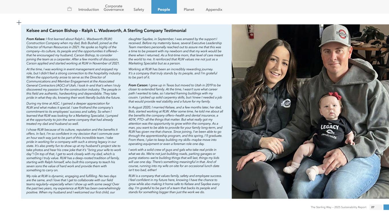 The Sterling Way — 2025 Sustainability Report 27 daughter Saydee, in September, I was amazed by the support I received. Before my maternity leave, several Executive Leadership Team members personally reached out to assure me that this was a time to be present with my newborn and that my work would be there when I returned. As a first-time mom, that level of care meant the world to me. It reinforced that RLW values me not just as a Marketing Specialist but as a person. Working at RLW has been an incredibly rewarding journey. It’s a company that truly stands by its people, and I’m grateful to be part of it. From Carson: I grew up in Texas but moved to Utah in 2019 to be closer to extended family. At the time, I wasn’t sure what career path I wanted to take, so I started framing buildings with my cousin. I picked up solid carpentry skills, but I knew I needed a job that would provide real stability and a future for my family. In August 2020, I married Kelsee, and a few months later, her dad, Bob, started working at RLW. After some time, he told me about all the benefits the company offers—health and dental insurance, a 401K, PTO—all the things that matter. But what really got my attention was the opportunity to grow within the company. As a man, you want to be able to provide for your family long-term, and RLW has given me that chance. Since joining, I’ve been able to go through the apprenticeship program, and this spring, I’ll graduate. From there, I plan to keep building my skills—maybe move into operating equipment or even a foreman role one day. I work with a solid crew of guys and gals who take real pride in what we do. We’re not just building roads, parking garages or pump stations—we’re building things that will last, things my kids will use one day. There’s something meaningful in that. And of course, running into my wife on-site for an occasional lunch date isn’t too bad, either! RLW is a company that values family, safety and employee success. I feel confident in my future here, knowing I have the chance to grow while also making it home safe to Kelsee and Saydee every day. I’m grateful to be part of a team that backs its people and stands for something bigger than just the work we do. From Kelsee: I first learned about Ralph L. Wadsworth (RLW) Construction Company when my dad, Bob Bushell, joined as the Director of Human Resources in 2021. He spoke so highly of the company—its culture, its people and the opportunities it offered— that he encouraged my husband, Carson Bishop, to consider joining the team as a carpenter. After a few months of discussion, Carson applied and started working at RLW in November of 2021. At the time, I was working in event management and enjoyed my role, but I didn’t feel a strong connection to the hospitality industry. When the opportunity arose to serve as the Director of Communications and Member Engagement at the Associated General Contractors (AGC) of Utah, I took it—and that’s when I truly discovered my passion for the construction industry. The people in this field are authentic, hardworking and dependable. They take pride in what they do, knowing their work literally builds the future. During my time at AGC, I gained a deeper appreciation for RLW and what makes it special. I saw firsthand the company’s commitment to its employees’ success and safety. So when I learned that RLW was looking for a Marketing Specialist, I jumped at the opportunity to join the same company that had already treated my dad and husband so well. I chose RLW because of its culture, reputation and the benefits it offers. In fact, I’m so confident in my decision that I commute over an hour each way just to be part of this incredible team. I take pride in working for a company with such a strong legacy in our state. It’s also pretty fun to show up at my husband’s project site to take photos and hear his crew joke that it’s “bring your wife to work day”! On top of that, I get to work closely with my dad, which is something I truly value. RLW has a deep-rooted tradition of family, starting with Ralph himself, who built this company to teach his seven sons the value of hard work and provide them with something to carry on. My role at RLW is dynamic, engaging and fulfilling. No two days are the same, and I love that I get to collaborate with our field teams regularly—especially when I show up with some swag! Over the past two years, my experience at RLW has been overwhelmingly positive. When my husband and I welcomed our first child, our Kelsee and Carson Bishop – Ralph L. Wadsworth, A Sterling Company Testimonial Introduction Safety Corporate Governance People AppendixPlanet