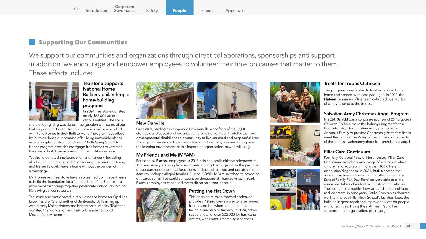 My Friends and Me (MFAM) Founded by Plateau employees in 2013, this non-profit initiative celebrated its 11th anniversary assisting families in need during Thanksgiving. In the past, the group purchased essential food items and sorted, packed and donated the items to underprivileged families. During COVID, MFAM switched to providing gift cards so families could still count on donations at Thanksgiving. In 2024, Plateau employees continued the tradition on a smaller scale. The Sterling Way — 2025 Sustainability Report 28 Supporting Our Communities We support our communities and organizations through direct collaborations, sponsorships and support. In addition, we encourage and empower employees to volunteer their time on causes that matter to them. These efforts include: Putting the Hat Down This ongoing mission-forward endeavor provides Plateau crews a way to raise money for one another when a team member is facing a hardship or tragedy. In 2024, crews raised a total of over $22,000 for hurricane victims, with Plateau matching donations. Treats for Troops Outreach This program is dedicated to treating troops, both home and abroad, with care packages. In 2024, the Plateau Kennesaw office team collected over 40 lbs of candy to send to the troops. Salvation Army Christmas Angel Program In 2024, Banicki was a corporate sponsor of 20 Forgotten Children. To help make the holidays brighter for the less fortunate, The Salvation Army partnered with Arizona’s Family to provide Christmas gifts to families in need throughout the Valley of the Sun and other parts of the state. salvationarmyphoenix.org/christmas-angel Pillar Care Continuum Formerly Cerebral Palsy of North Jersey, Pillar Care Continuum provides a wide range of services to infants, children and adults with more than 100 different disabilities/diagnoses. In 2024, Petillo hosted the annual Touch-a-Truck event at the Pillar Elementary School Family Fun Day. Families were able to climb inside and take a close look at construction vehicles. The outing had a reptile show, arts and crafts and food and ice cream. In prior years, Petillo Companies donated work to improve Pillar High School’s facilities, keep the building in good repair and improve services for people with disabilities. This is the sixth year Petillo has supported the organization. pillarnj.org Tealstone supports National Home Builders’ philanthropic home-building programs In 2024, Tealstone donated nearly $65,000 across various entities. The lion’s share of our gifting was done in conjunction with some of our builder partners. For the last several years, we have worked with Pulte Homes in their Built to Honor® program, described by Pulte as “living our promise of building incredible places where people can live their dreams.” PulteGroup’s Built to Honor program provides mortgage-free homes to veterans living with disabilities as a result of their military service. Teasltone donated the foundation and flatwork, including all labor and materials, so that deserving veteran Chris Irving and his family could have a home without the burden of a mortgage. M/I Homes and Tealstone have also teamed up in recent years to build the foundation for a “benefit home” for Pelotonia, a movement that brings together passionate individuals to fund life-saving cancer research. Tealstone also participated in rebuilding the home for Opal Lee, known as the “Grandmother of Junteenth.” By teaming up with History Maker Homes and Habitat for Humanity, Tealstone donated the foundation and flatwork needed to build Mrs. Lee’s new home. New Danville Since 2021, Sterling has supported New Danville, a not-for-profit 501(c)(3) charitable and educational organization providing adults with intellectual and developmental disabilities an opportunity to live enriched and purposeful lives. Through corporate staff volunteer days and donations, we seek to upgrade the learning environment of this important organization. newdanville.org Introduction Safety Corporate Governance People AppendixPlanet