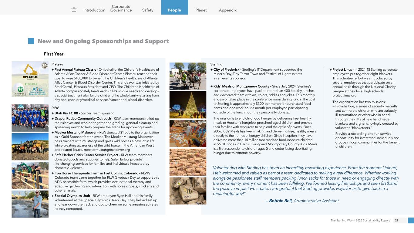 The Sterling Way — 2025 Sustainability Report 29 New and Ongoing Sponsorships and Support Plateau + First Annual Plateau Classic – On behalf of the Children’s Healthcare of Atlanta Aflac Cancer & Blood Disorder Center, Plateau reached their goal to raise $100,000 to benefit the Children’s Healthcare of Atlanta Aflac Cancer & Blood Disorder Center. This endeavor was initiated by Brad Carroll, Plateau’s President and CEO. The Children’s Healthcare of Atlanta compassionately treats each child’s unique needs and develops a special treatment plan for the child and the whole family—starting from day one. choa.org/medical-services/cancer-and-blood-disorders RLW + Utah Rio FC 08 – Soccer Team sponsor + Draper Rodeo Community Outreach – RLW team members rolled up their sleeves and worked together on grading, general cleanup and spreading mulch to help prepare the arena for upcoming events. + Meeker Mustang Makeover – RLW donated $1,000 to the organization as a Gold Sponsor for the event. The Meeker Mustang Makeover pairs trainers with mustangs and gives wild horses a new lot in life while creating awareness of the wild horse in the American West and related issues. meekermustangmakeover.org + Safe Harbor Crisis Center Service Project – RLW team members donated goods and supplies to help Safe Harbor provide life-changing services for families and individuals impacted by domestic violence. + Iron Horse Therapeutic Farm in Fort Collins, Colorado – RLW’s Colorado team came together for RLW Giveback Day to support this ADA-accessible farm, which provides occupational therapy and adaptive gardening and interaction with horses, goats, chickens and other animals. + Special Olympics Utah – RLW employee Ryan Hall and his family volunteered at the Special Olympics’ Track Day. They helped set up and tear down the track and got to cheer on some amazing athletes as they competed. Sterling + City of Frederick – Sterling’s IT Department supported the Miner’s Day, Tiny Terror Town and Festival of Lights events as an events sponsor. + Kids’ Meals of Montgomery County – Since July 2024, Sterling’s corporate employees have packed more than 400 healthy lunches and decorated them with art, colors, riddles and jokes. This monthly endeavor takes place in the conference room during lunch. The cost to Sterling is approximately $300 per month for purchased food items and one work hour a month per employee participating (outside of the lunch hour they personally donate). The mission is to end childhood hunger by delivering free, healthy meals to Houston’s hungriest preschool-aged children and provide their families with resources to help end the cycle of poverty. Since 2006, Kids’ Meals has been making and delivering free, healthy meals directly to the homes of hungry children. Since inception, they have delivered more than 14 million free meals to food-insecure children in 56 ZIP codes in Harris County and Montgomery County. Kids’ Meals is a first responder to children ages 5 and under facing debilitating hunger due to extreme poverty. + Project Linus – In 2024, 15 Sterling corporate employees put together eight blankets. This volunteer effort was introduced by several employees that participate on an annual basis through the National Charity League at their local high schools. projectlinus.org The organization has two missions: — Provide love, a sense of security, warmth and comfort to children who are seriously ill, traumatized or otherwise in need through the gifts of new handmade blankets and afghans, lovingly created by volunteer “blanketeers.” — Provide a rewarding and fun service opportunity for interested individuals and groups in local communities for the benefit of children. First Year “ Volunteering with Sterling has been an incredibly rewarding experience. From the moment I joined, I felt welcomed and valued as part of a team dedicated to making a real difference. Whether working alongside passionate staff members packing lunch sacks for those in need or engaging directly with the community, every moment has been fulfilling. I’ve formed lasting friendships and seen firsthand the positive impact we create. I am grateful that Sterling provides ways for us to give back in a meaningful way!” — Bobbie Bell, Administrative Assistant Introduction Safety Corporate Governance People AppendixPlanet