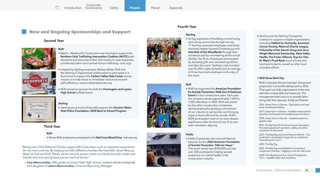 The Sterling Way — 2025 Sustainability Report 30 New and Ongoing Sponsorships and Support RLW + Ralph L. Wadsworth Construction was honored to support the Northern Utah Trafficking Intervention Coalition (NUTIC) with donations and resources in their vital mission to raise awareness, provide education and combat human trafficking. nutic.org/ + Initiated by Sterling employee, Melissa Wilde, RLW and the Sterling IT Department collaborated to participate in a food drive to support the Carbon Valley Help Center whose mission is to help those in immediate need move toward self-sufficiency. carbonvalleyhelpcenter.org + RLW served as sponsor for both the Farmington and Layton High School softball teams. Sterling + As big supporters of building a more loving and caring community through service, 17 Sterling corporate employees and family members helped spread Christmas joy with Interfaith of the Woodlands through their donations and by volunteering at the annual Holiday Toy Drive. Employees participated by donating gifts and volunteering before and after the event. Sterling’s cost included over $1,200 in gifts donated plus an average of three hours per employee on the day of the event. RLW + RLW has supported the American Foundation for Suicide Prevention: Walk Out of Darkness Event for four consecutive years. Each year, the company serves approximately 1,000 to 1,200 attendees. In 2024, RLW was joined by five other construction companies, demonstrating the growing commitment of our industry to saving lives and bringing hope to those affected by suicide. RLW’s 2024 participation took on an even deeper significance after the loss of one of its own team members. afsp.org Petillo + Petillo Companies was a proud Platinum Sponsor for the 2024 American Foundation of Suicide Prevention “Hike for Hope.” This event raised over $100,000 and had over 500 participants helping spread awareness on mental health in the construction industry. + Sterling and the Sterling Companies continue to support multiple organizations, including Habitat for Humanity, American Cancer Society, National Charity League, Fellowship of the Sword, Doug and Jerry Wright Memorial Scholarship, West Valley Health, The Foster Alliance, Toys for Tots, St. Mary’s Food Bank, local schools and local sports teams, as well as other local volunteer efforts. + RLW Gives Back Day RLW’s Colorado Division has been doing local projects for non-profits dating back to 2016. Their goal is to help organizations in the area with their unique skills and resources. The management team joins in to provide labor along with their spouses, family and friends. 2016: Urban Farm in Denver – Demolition and haul away of existing building 2017: Urban Farm in Denver – Installed metal roofs for goat huts and hauled and installed posts and fence. 2018: Urban Farm in Denver – Installed pavers for gazebo area 2019: The Big Dig with American Cancer Association – Provided equipment operators, safety and other volunteers for the event 2021: The Big Dig and Zuma Rescue’s Ranch – Our small team completed a large fence installation, impressing the ranch 2022: The Big Dig 2023: The Big Dig and Habitat for Humanity in Longmont Colorado – Digging in the dirt with picks 2024: The Big Dig and Iron Horse Therapeutic Farm – Installed water line and fence Second Year Fourth Year RLW + Eleven RLW employees participated in the Red Cross Blood Drive. redcross.org Third Year “ Being part of the National Charity League (NCL) has been such an awesome experience for my mom and me. By helping out with different charities like Interfaith, Smart Rescue, Keep Us Fed and Kids’ Meals, we’ve not only grown closer as a family but also made new friends who love giving back just as much as we do.” — Caty Abercrombie, 10th grader at Grand Oaks High School, student athlete (volleyball), and daughter of Jaima Abercrombie, Financial Reporting Manager Sterling + Sterling was proud to financially support the Houston Metro Area Police Foundation, 2024 Back to School Program. Introduction Safety Corporate Governance People AppendixPlanet