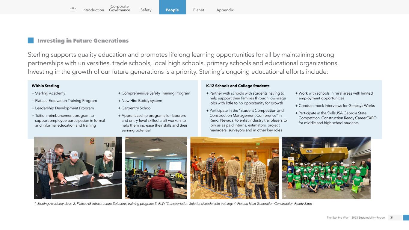 1. Sterling Academy class; 2. Plateau (E-Infrastructure Solutions) training program; 3. RLW (Transportation Solutions) leadership training; 4. Plateau Next Generation Construction Ready Expo 1 2 3 4 The Sterling Way — 2025 Sustainability Report 31 Investing in Future Generations Sterling supports quality education and promotes lifelong learning opportunities for all by maintaining strong partnerships with universities, trade schools, local high schools, primary schools and educational organizations. Investing in the growth of our future generations is a priority. Sterling’s ongoing educational efforts include: + Sterling Academy + Plateau Excavation Training Program + Leadership Development Program + Tuition reimbursement program to support employee participation in formal and informal education and training + Comprehensive Safety Training Program + New Hire Buddy system + Carpentry School + Apprenticeship programs for laborers and entry-level skilled craft workers to help them increase their skills and their earning potential + Partner with schools with students having to help support their families through low-wage jobs with little to no opportunity for growth + Participate in the “Student Competition and Construction Management Conference” in Reno, Nevada, to enlist industry trailblazers to join us as paid interns, estimators, project managers, surveyors and in other key roles + Work with schools in rural areas with limited employment opportunities + Conduct mock interviews for Genesys Works + Participate in the SkillsUSA Georgia State Competition, Construction Ready CareerEXPO for middle and high school students Within Sterling K-12 Schools and College Students Introduction Safety Corporate Governance People AppendixPlanet