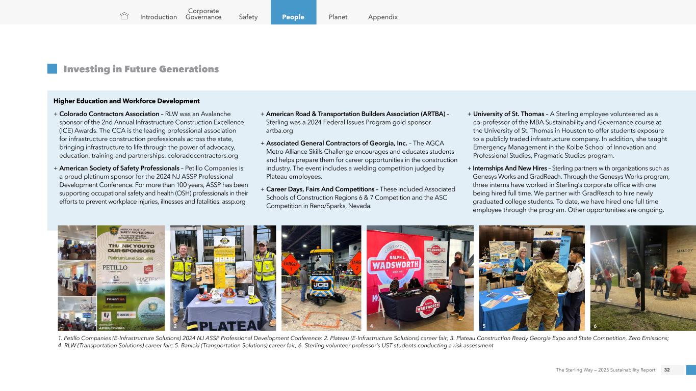 1. Petillo Companies (E-Infrastructure Solutions) 2024 NJ ASSP Professional Development Conference; 2. Plateau (E-Infrastructure Solutions) career fair; 3. Plateau Construction Ready Georgia Expo and State Competition, Zero Emissions; 4. RLW (Transportation Solutions) career fair; 5. Banicki (Transportation Solutions) career fair; 6. Sterling volunteer professor’s UST students conducting a risk assessment The Sterling Way — 2025 Sustainability Report 32 Investing in Future Generations Higher Education and Workforce Development + Colorado Contractors Association – RLW was an Avalanche sponsor of the 2nd Annual Infrastructure Construction Excellence (ICE) Awards. The CCA is the leading professional association for infrastructure construction professionals across the state, bringing infrastructure to life through the power of advocacy, education, training and partnerships. coloradocontractors.org + American Society of Safety Professionals – Petillo Companies is a proud platinum sponsor for the 2024 NJ ASSP Professional Development Conference. For more than 100 years, ASSP has been supporting occupational safety and health (OSH) professionals in their efforts to prevent workplace injuries, illnesses and fatalities. assp.org + American Road & Transportation Builders Association (ARTBA) – Sterling was a 2024 Federal Issues Program gold sponsor. artba.org + Associated General Contractors of Georgia, Inc. – The AGCA Metro Alliance Skills Challenge encourages and educates students and helps prepare them for career opportunities in the construction industry. The event includes a welding competition judged by Plateau employees. + Career Days, Fairs And Competitions – These included Associated Schools of Construction Regions 6 & 7 Competition and the ASC Competition in Reno/Sparks, Nevada. + University of St. Thomas – A Sterling employee volunteered as a co-professor of the MBA Sustainability and Governance course at the University of St. Thomas in Houston to offer students exposure to a publicly traded infrastructure company. In addition, she taught Emergency Management in the Kolbe School of Innovation and Professional Studies, Pragmatic Studies program. + Internships And New Hires – Sterling partners with organizations such as Genesys Works and GradReach. Through the Genesys Works program, three interns have worked in Sterling’s corporate office with one being hired full time. We partner with GradReach to hire newly graduated college students. To date, we have hired one full time employee through the program. Other opportunities are ongoing. 1 2 3 4 5 6 Introduction Safety Corporate Governance People AppendixPlanet