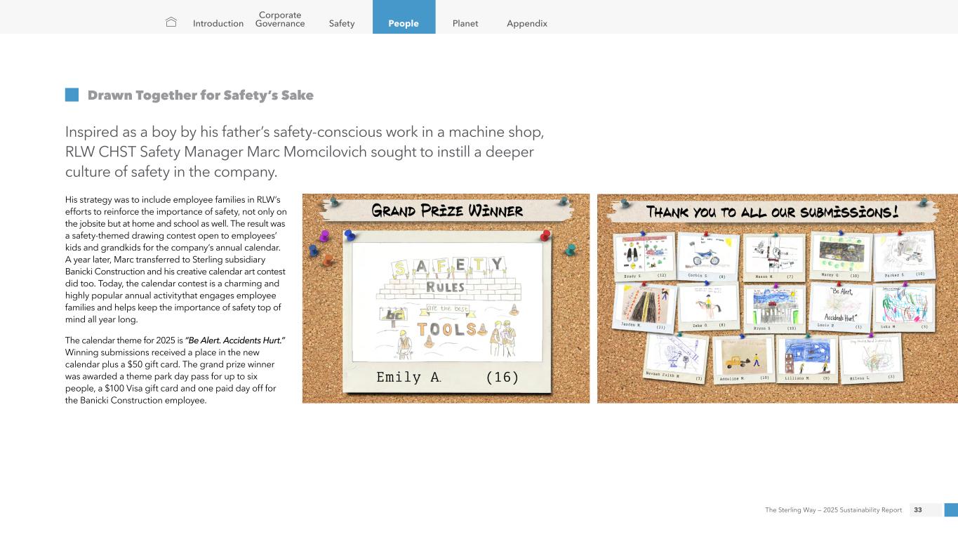 The Sterling Way — 2025 Sustainability Report 33 Drawn Together for Safety’s Sake Inspired as a boy by his father’s safety-conscious work in a machine shop, RLW CHST Safety Manager Marc Momcilovich sought to instill a deeper culture of safety in the company. His strategy was to include employee families in RLW’s efforts to reinforce the importance of safety, not only on the jobsite but at home and school as well. The result was a safety-themed drawing contest open to employees’ kids and grandkids for the company’s annual calendar. A year later, Marc transferred to Sterling subsidiary Banicki Construction and his creative calendar art contest did too. Today, the calendar contest is a charming and highly popular annual activitythat engages employee families and helps keep the importance of safety top of mind all year long. The calendar theme for 2025 is “Be Alert. Accidents Hurt.” Winning submissions received a place in the new calendar plus a $50 gift card. The grand prize winner was awarded a theme park day pass for up to six people, a $100 Visa gift card and one paid day off for the Banicki Construction employee. Introduction Safety Corporate Governance People AppendixPlanet