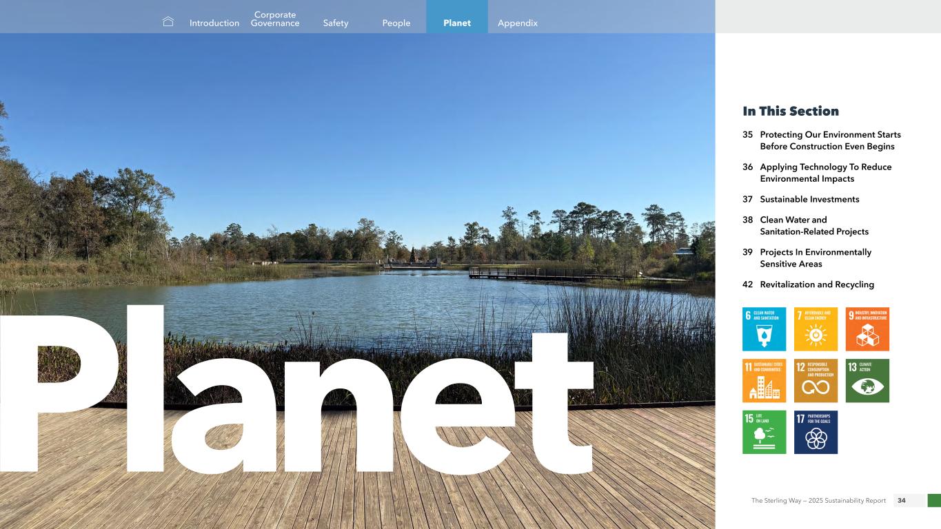 The Sterling Way — 2025 Sustainability Report 34 In This Section 35 Protecting Our Environment Starts Before Construction Even Begins 36 Applying Technology To Reduce Environmental Impacts 37 Sustainable Investments 38 Clean Water and Sanitation-Related Projects 39 Projects In Environmentally Sensitive Areas 42 Revitalization and Recycling Planet AppendixPeopleSafety Corporate GovernanceIntroduction Planet