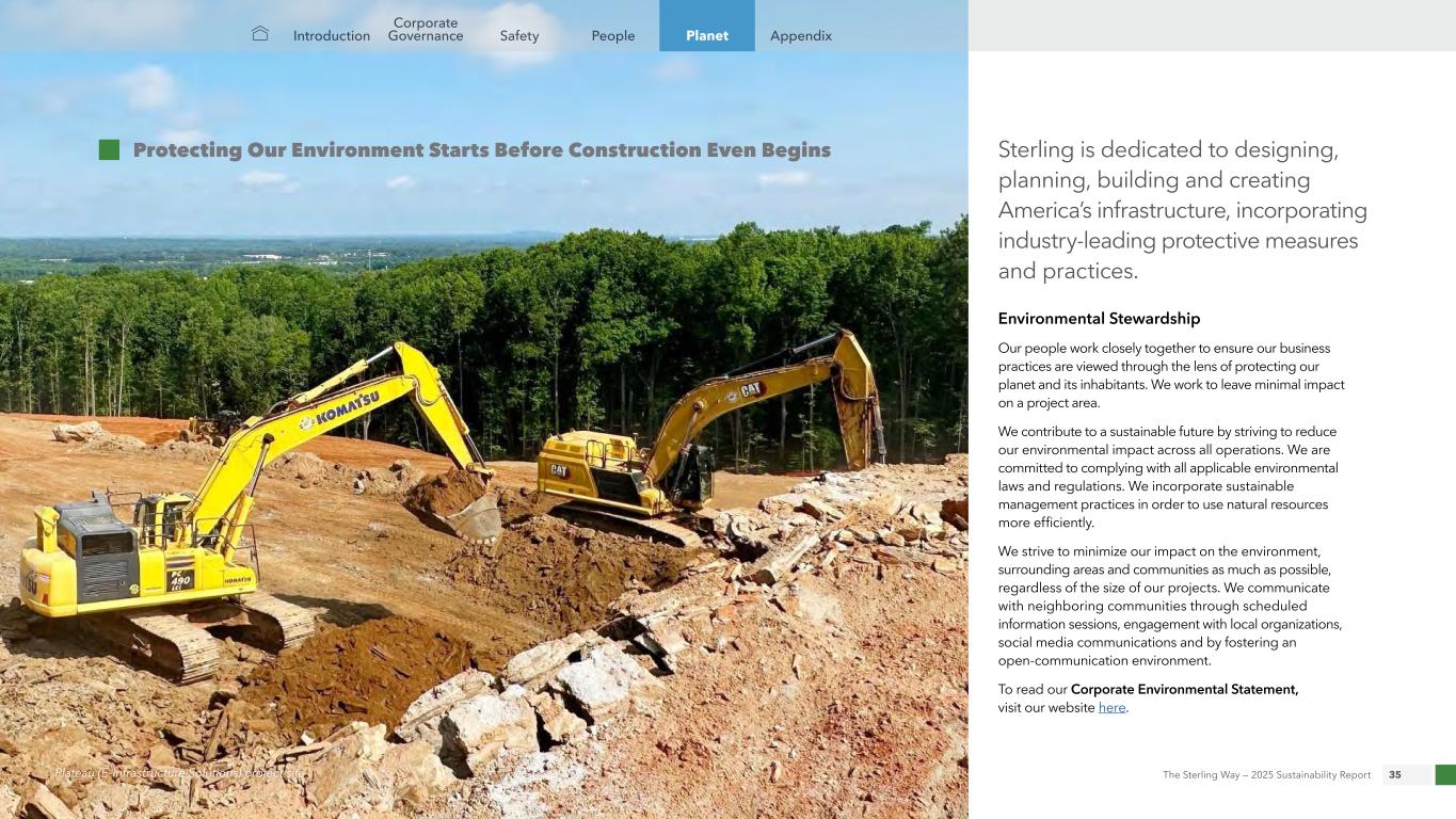 Plateau (E-Infrastructure Solutions) project site The Sterling Way — 2025 Sustainability Report 35 Protecting Our Environment Starts Before Construction Even Begins Sterling is dedicated to designing, planning, building and creating America’s infrastructure, incorporating industry-leading protective measures and practices. Environmental Stewardship Our people work closely together to ensure our business practices are viewed through the lens of protecting our planet and its inhabitants. We work to leave minimal impact on a project area. We contribute to a sustainable future by striving to reduce our environmental impact across all operations. We are committed to complying with all applicable environmental laws and regulations. We incorporate sustainable management practices in order to use natural resources more efficiently. We strive to minimize our impact on the environment, surrounding areas and communities as much as possible, regardless of the size of our projects. We communicate with neighboring communities through scheduled information sessions, engagement with local organizations, social media communications and by fostering an open-communication environment. To read our Corporate Environmental Statement, visit our website here. PlanetIntroduction Corporate Governance Safety People Appendix
