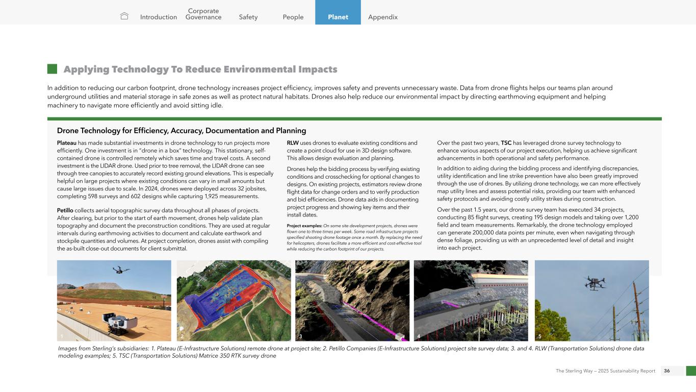The Sterling Way — 2025 Sustainability Report 36 Applying Technology To Reduce Environmental Impacts In addition to reducing our carbon footprint, drone technology increases project efficiency, improves safety and prevents unnecessary waste. Data from drone flights helps our teams plan around underground utilities and material storage in safe zones as well as protect natural habitats. Drones also help reduce our environmental impact by directing earthmoving equipment and helping machinery to navigate more efficiently and avoid sitting idle. Plateau has made substantial investments in drone technology to run projects more efficiently. One investment is in “drone in a box” technology. This stationary, self- contained drone is controlled remotely which saves time and travel costs. A second investment is the LIDAR drone. Used prior to tree removal, the LIDAR drone can see through tree canopies to accurately record existing ground elevations. This is especially helpful on large projects where existing conditions can vary in small amounts but cause large issues due to scale. In 2024, drones were deployed across 32 jobsites, completing 598 surveys and 602 designs while capturing 1,925 measurements. Petillo collects aerial topographic survey data throughout all phases of projects. After clearing, but prior to the start of earth movement, drones help validate plan topography and document the preconstruction conditions. They are used at regular intervals during earthmoving activities to document and calculate earthwork and stockpile quantities and volumes. At project completion, drones assist with compiling the as-built close-out documents for client submittal. Drone Technology for Efficiency, Accuracy, Documentation and Planning RLW uses drones to evaluate existing conditions and create a point cloud for use in 3D design software. This allows design evaluation and planning. Drones help the bidding process by verifying existing conditions and crosschecking for optional changes to designs. On existing projects, estimators review drone flight data for change orders and to verify production and bid efficiencies. Drone data aids in documenting project progress and showing key items and their install dates. Project examples: On some site development projects, drones were flown one to three times per week. Some road infrastructure projects specified shooting drone footage once a month. By replacing the need for helicopters, drones facilitate a more efficient and cost-effective tool while reducing the carbon footprint of our projects. Over the past two years, TSC has leveraged drone survey technology to enhance various aspects of our project execution, helping us achieve significant advancements in both operational and safety performance. In addition to aiding during the bidding process and identifying discrepancies, utility identification and line strike prevention have also been greatly improved through the use of drones. By utilizing drone technology, we can more effectively map utility lines and assess potential risks, providing our team with enhanced safety protocols and avoiding costly utility strikes during construction. Over the past 1.5 years, our drone survey team has executed 34 projects, conducting 85 flight surveys, creating 195 design models and taking over 1,200 field and team measurements. Remarkably, the drone technology employed can generate 200,000 data points per minute, even when navigating through dense foliage, providing us with an unprecedented level of detail and insight into each project. Images from Sterling’s subsidiaries: 1. Plateau (E-Infrastructure Solutions) remote drone at project site; 2. Petillo Companies (E-Infrastructure Solutions) project site survey data; 3. and 4. RLW (Transportation Solutions) drone data modeling examples; 5. TSC (Transportation Solutions) Matrice 350 RTK survey drone 1 2 3 4 5 Introduction Safety Corporate Governance People AppendixPlanet