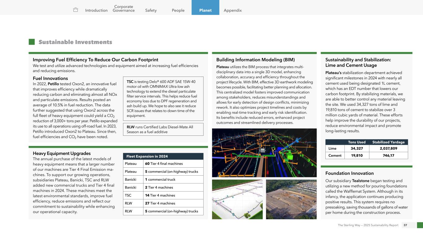 The Sterling Way — 2025 Sustainability Report 37 Sustainable Investments Improving Fuel Efficiency To Reduce Our Carbon Footprint We test and utilize advanced technologies and equipment aimed at increasing fuel efficiencies and reducing emissions. Heavy Equipment Upgrades The annual purchase of the latest models of heavy equipment means that a larger number of our machines are Tier 4 Final Emission ma- chines. To support our growing operations, subsidiaries Plateau, Banicki, TSC and RLW added new commercial trucks and Tier 4 final machines in 2024. These machines meet the latest environmental standards, improve fuel efficiency, reduce emissions and reflect our commitment to sustainability while enhancing our operational capacity. Fuel Innovations In 2022, Petillo tested Oxon2, an innovative fuel that improves efficiency while dramatically reducing carbon and eliminating almost all NOx and particulate emissions. Results posted an average of 10.5% in fuel reduction. The data further suggested that using Oxon2 across the full fleet of heavy equipment could yield a CO2 reduction of 3,000+ tons per year. Petillo expanded its use to all operations using off-road fuel. In 2023, Petillo introduced Oxon2 to Plateau. Since then, fuel efficiencies and CO2 have been noted. TSC is testing Delo® 600 ADF SAE 15W-40 motor oil with OMNIMAX Ultra-low ash technology to extend the diesel particulate filter service intervals. This helps reduce fuel economy loss due to DPF regeneration and ash build up. We hope to also see it reduce SCR issues that relates to down time of the equipment. Fleet Expansion in 2024 Plateau 60 Tier 4 final machines Plateau 5 commercial (on-highway) trucks Banicki 1 commercial truck Banicki 2 Tier 4 machines TSC 14 Tier 4 machines RLW 27 Tier 4 machines RLW 5 commercial (on-highway) trucks RLW runs Certified Labs Diesel-Mate All Season as a fuel additive Building Information Modeling (BIM) Plateau utilizes the BIM process that integrates multi- disciplinary data into a single 3D model, enhancing collaboration, accuracy and efficiency throughout the project lifecycle. With BIM, effective 3D earthwork modeling becomes possible, facilitating better planning and allocation. This centralized model fosters improved communication among stakeholders, reduces misunderstandings and allows for early detection of design conflicts, minimizing rework. It also optimizes project timelines and costs by enabling real-time tracking and early risk identification. Its benefits include reduced errors, enhanced project outcomes and streamlined delivery processes. Sustainability and Stabilization: Lime and Cement Usage Plateau’s stabilization department achieved significant milestones in 2024 with nearly all cement used being designated 1L cement, which has an EDT number that lowers our carbon footprint. By stabilizing materials, we are able to better control any material leaving the site. We used 34,327 tons of lime and 19,810 tons of cement to stabilize over 3 million cubic yards of material. These efforts help improve the durability of our projects, reduce environmental impact and promote long-lasting results. Foundation Innovation Our subsidiary Tealstone began testing and utilizing a new method for pouring foundations called the Wafflemat System. Although in its infancy, the application continues producing positive results. This system requires no presoaking, saving thousands of gallons of water per home during the construction process. Tons Used Stabilized Yardage Lime 34,327 2,037,809 Cement 19,810 746,17 Introduction Safety Corporate Governance People AppendixPlanet