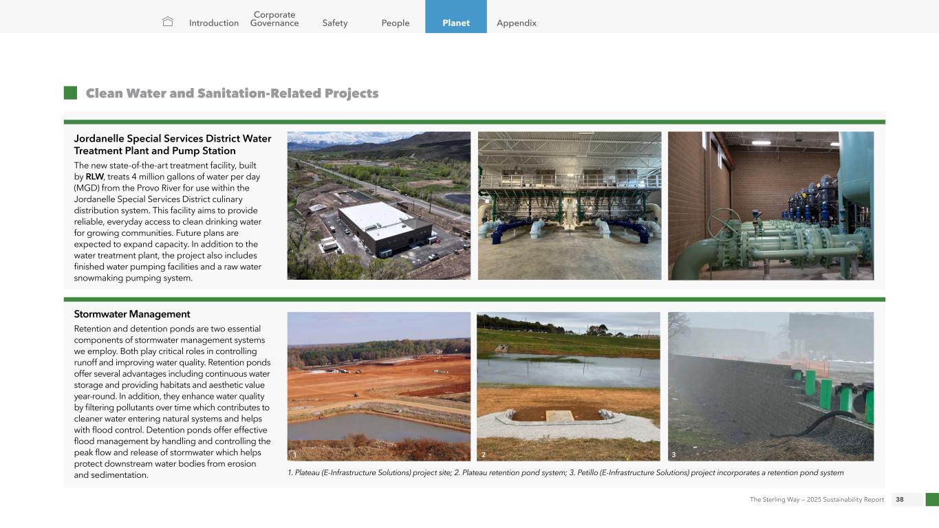 The Sterling Way — 2025 Sustainability Report 38 Stormwater Management Retention and detention ponds are two essential components of stormwater management systems we employ. Both play critical roles in controlling runoff and improving water quality. Retention ponds offer several advantages including continuous water storage and providing habitats and aesthetic value year-round. In addition, they enhance water quality by filtering pollutants over time which contributes to cleaner water entering natural systems and helps with flood control. Detention ponds offer effective flood management by handling and controlling the peak flow and release of stormwater which helps protect downstream water bodies from erosion and sedimentation. Clean Water and Sanitation-Related Projects 1. Plateau (E-Infrastructure Solutions) project site; 2. Plateau retention pond system; 3. Petillo (E-Infrastructure Solutions) project incorporates a retention pond system 1 2 3 Jordanelle Special Services District Water Treatment Plant and Pump Station The new state-of-the-art treatment facility, built by RLW, treats 4 million gallons of water per day (MGD) from the Provo River for use within the Jordanelle Special Services District culinary distribution system. This facility aims to provide reliable, everyday access to clean drinking water for growing communities. Future plans are expected to expand capacity. In addition to the water treatment plant, the project also includes finished water pumping facilities and a raw water snowmaking pumping system. Introduction Safety Corporate Governance People AppendixPlanet