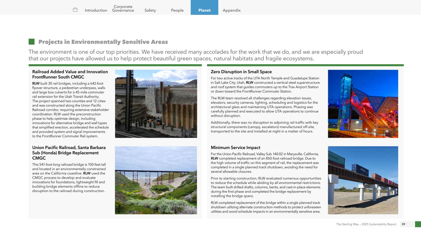 The Sterling Way — 2025 Sustainability Report 39 Projects in Environmentally Sensitive Areas Railroad Added Value and Innovation FrontRunner South CMGC RLW built 30 rail bridges, including a 642-foot flyover structure, a pedestrian underpass, walls and large box culverts for a 45-mile commuter rail extension for the Utah Transit Authority. The project spanned two counties and 12 cities and was constructed along the Union Pacific Railroad corridor, requiring extensive stakeholder coordination. RLW used the preconstruction phase to help optimize design, including innovations for alternative bridge and wall types that simplified erection, accelerated the schedule and provided system and signal improvements to the FrontRunner Commuter Rail system. Union Pacific Railroad, Santa Barbara Sub (Honda) Bridge Replacement CMGC This 541-foot-long railroad bridge is 100 feet tall and located in an environmentally constrained area on the California coastline. RLW used the CMGC process to develop and evaluate innovations for foundations, lightweight fill and building bridge elements offline to reduce disruption to the railroad during construction. Zero Disruption in Small Space For two active tracks of the UTA North Temple and Guadalupe Station in Salt Lake City, Utah, RLW constructed a vertical steel superstructure and roof system that guides commuters up to the Trax Airport Station or down toward the FrontRunner Commuter Station. The RLW team resolved all challenges regarding elevation issues, elevators, security cameras, lighting, scheduling and logistics for the architectural glass and maintaining UTA operations. Phasing was carefully planned and executed to allow UTA operations to continue without disruption. Additionally, there was no disruption to adjoining rail traffic with key structural components (canopy, escalators) manufactured off-site, transported to the site and installed at night in a matter of hours. Minimum Service Impact For the Union Pacific Railroad, Valley Sub 140.02 in Marysville, California, RLW completed replacement of an 850-foot railroad bridge. Due to the high volume of traffic on this segment of rail, the replacement was completed in a single planned track shutdown, avoiding the need for several allowable closures. Prior to starting construction, RLW evaluated numerous opportunities to reduce the schedule while abiding by all environmental restrictions. The team built drilled shafts, columns, bents, and cast-in-place elements during the first phase and completed the bridge replacement by installing the bridge spans. RLW completed replacement of the bridge within a single planned track shutdown utilizing alternate construction methods to protect unforeseen utilities and avoid schedule impacts in an environmentally sensitive area. The environment is one of our top priorities. We have received many accolades for the work that we do, and we are especially proud that our projects have allowed us to help protect beautiful green spaces, natural habitats and fragile ecosystems. Introduction Safety Corporate Governance People AppendixPlanet