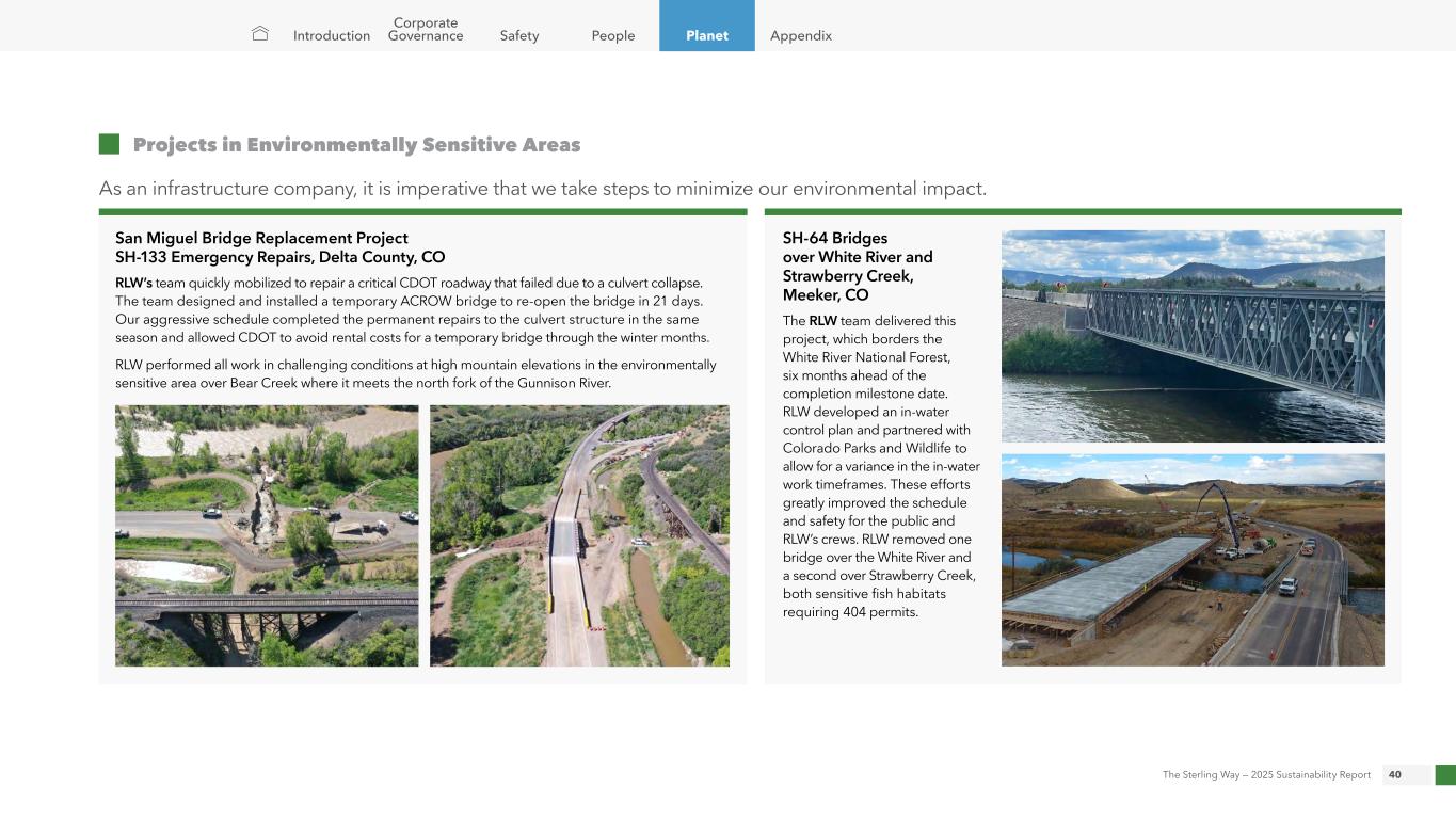 The Sterling Way — 2025 Sustainability Report 40 San Miguel Bridge Replacement Project SH-133 Emergency Repairs, Delta County, CO RLW’s team quickly mobilized to repair a critical CDOT roadway that failed due to a culvert collapse. The team designed and installed a temporary ACROW bridge to re-open the bridge in 21 days. Our aggressive schedule completed the permanent repairs to the culvert structure in the same season and allowed CDOT to avoid rental costs for a temporary bridge through the winter months. RLW performed all work in challenging conditions at high mountain elevations in the environmentally sensitive area over Bear Creek where it meets the north fork of the Gunnison River. SH-64 Bridges over White River and Strawberry Creek, Meeker, CO The RLW team delivered this project, which borders the White River National Forest, six months ahead of the completion milestone date. RLW developed an in-water control plan and partnered with Colorado Parks and Wildlife to allow for a variance in the in-water work timeframes. These efforts greatly improved the schedule and safety for the public and RLW’s crews. RLW removed one bridge over the White River and a second over Strawberry Creek, both sensitive fish habitats requiring 404 permits. Projects in Environmentally Sensitive Areas As an infrastructure company, it is imperative that we take steps to minimize our environmental impact. Introduction Safety Corporate Governance People AppendixPlanet