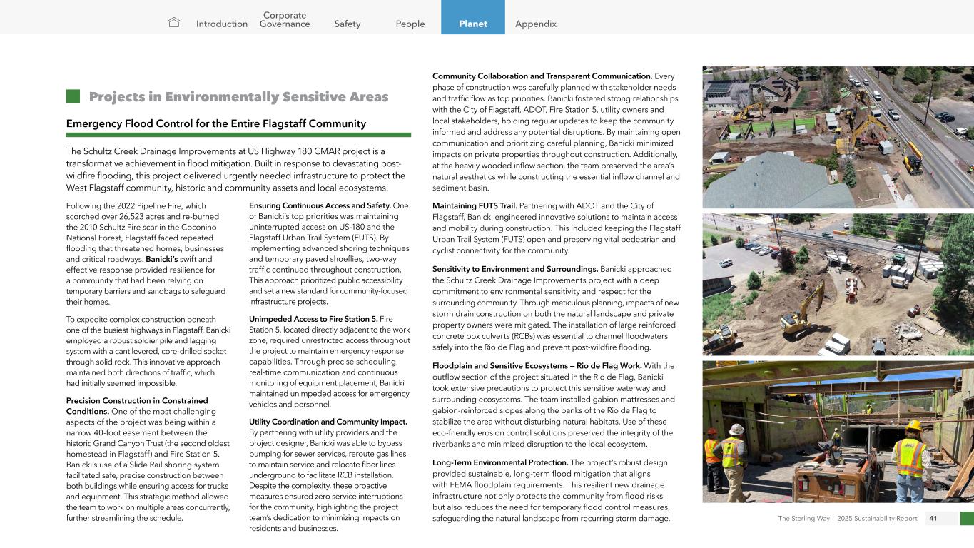 The Sterling Way — 2025 Sustainability Report 41 Emergency Flood Control for the Entire Flagstaff Community Following the 2022 Pipeline Fire, which scorched over 26,523 acres and re-burned the 2010 Schultz Fire scar in the Coconino National Forest, Flagstaff faced repeated flooding that threatened homes, businesses and critical roadways. Banicki’s swift and effective response provided resilience for a community that had been relying on temporary barriers and sandbags to safeguard their homes. To expedite complex construction beneath one of the busiest highways in Flagstaff, Banicki employed a robust soldier pile and lagging system with a cantilevered, core-drilled socket through solid rock. This innovative approach maintained both directions of traffic, which had initially seemed impossible. Precision Construction in Constrained Conditions. One of the most challenging aspects of the project was being within a narrow 40-foot easement between the historic Grand Canyon Trust (the second oldest homestead in Flagstaff) and Fire Station 5. Banicki’s use of a Slide Rail shoring system facilitated safe, precise construction between both buildings while ensuring access for trucks and equipment. This strategic method allowed the team to work on multiple areas concurrently, further streamlining the schedule. Ensuring Continuous Access and Safety. One of Banicki’s top priorities was maintaining uninterrupted access on US-180 and the Flagstaff Urban Trail System (FUTS). By implementing advanced shoring techniques and temporary paved shoeflies, two-way traffic continued throughout construction. This approach prioritized public accessibility and set a new standard for community-focused infrastructure projects. Unimpeded Access to Fire Station 5. Fire Station 5, located directly adjacent to the work zone, required unrestricted access throughout the project to maintain emergency response capabilities. Through precise scheduling, real-time communication and continuous monitoring of equipment placement, Banicki maintained unimpeded access for emergency vehicles and personnel. Utility Coordination and Community Impact. By partnering with utility providers and the project designer, Banicki was able to bypass pumping for sewer services, reroute gas lines to maintain service and relocate fiber lines underground to facilitate RCB installation. Despite the complexity, these proactive measures ensured zero service interruptions for the community, highlighting the project team’s dedication to minimizing impacts on residents and businesses. Community Collaboration and Transparent Communication. Every phase of construction was carefully planned with stakeholder needs and traffic flow as top priorities. Banicki fostered strong relationships with the City of Flagstaff, ADOT, Fire Station 5, utility owners and local stakeholders, holding regular updates to keep the community informed and address any potential disruptions. By maintaining open communication and prioritizing careful planning, Banicki minimized impacts on private properties throughout construction. Additionally, at the heavily wooded inflow section, the team preserved the area’s natural aesthetics while constructing the essential inflow channel and sediment basin. Maintaining FUTS Trail. Partnering with ADOT and the City of Flagstaff, Banicki engineered innovative solutions to maintain access and mobility during construction. This included keeping the Flagstaff Urban Trail System (FUTS) open and preserving vital pedestrian and cyclist connectivity for the community. Sensitivity to Environment and Surroundings. Banicki approached the Schultz Creek Drainage Improvements project with a deep commitment to environmental sensitivity and respect for the surrounding community. Through meticulous planning, impacts of new storm drain construction on both the natural landscape and private property owners were mitigated. The installation of large reinforced concrete box culverts (RCBs) was essential to channel floodwaters safely into the Rio de Flag and prevent post-wildfire flooding. Floodplain and Sensitive Ecosystems — Rio de Flag Work. With the outflow section of the project situated in the Rio de Flag, Banicki took extensive precautions to protect this sensitive waterway and surrounding ecosystems. The team installed gabion mattresses and gabion-reinforced slopes along the banks of the Rio de Flag to stabilize the area without disturbing natural habitats. Use of these eco-friendly erosion control solutions preserved the integrity of the riverbanks and minimized disruption to the local ecosystem. Long-Term Environmental Protection. The project’s robust design provided sustainable, long-term flood mitigation that aligns with FEMA floodplain requirements. This resilient new drainage infrastructure not only protects the community from flood risks but also reduces the need for temporary flood control measures, safeguarding the natural landscape from recurring storm damage. The Schultz Creek Drainage Improvements at US Highway 180 CMAR project is a transformative achievement in flood mitigation. Built in response to devastating post- wildfire flooding, this project delivered urgently needed infrastructure to protect the West Flagstaff community, historic and community assets and local ecosystems. Projects in Environmentally Sensitive Areas Introduction Safety Corporate Governance People AppendixPlanet
