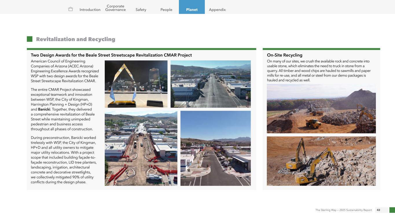 The Sterling Way — 2025 Sustainability Report 42 Revitalization and Recycling American Council of Engineering Companies of Arizona (ACEC Arizona) Engineering Excellence Awards recognized WSP with two design awards for the Beale Street Streetscape Revitalization CMAR. The entire CMAR Project showcased exceptional teamwork and innovation between WSP, the City of Kingman, Harrington Planning + Design (HP+D) and Banicki. Together, they delivered a comprehensive revitalization of Beale Street while maintaining unimpeded pedestrian and business access throughout all phases of construction. During preconstruction, Banicki worked tirelessly with WSP, the City of Kingman, HP+D and all utility owners to mitigate major utility relocations. With a project scope that included building façade-to- façade reconstruction, LID tree planters, landscaping, irrigation, architectural concrete and decorative streetlights, we collectively mitigated 90% of utility conflicts during the design phase. On-Site Recycling On many of our sites, we crush the available rock and concrete into usable stone, which eliminates the need to truck in stone from a quarry. All timber and wood chips are hauled to sawmills and paper mills for re-use, and all metal or steel from our demo packages is hauled and recycled as well. Two Design Awards for the Beale Street Streetscape Revitalization CMAR Project Introduction Safety Corporate Governance People AppendixPlanet