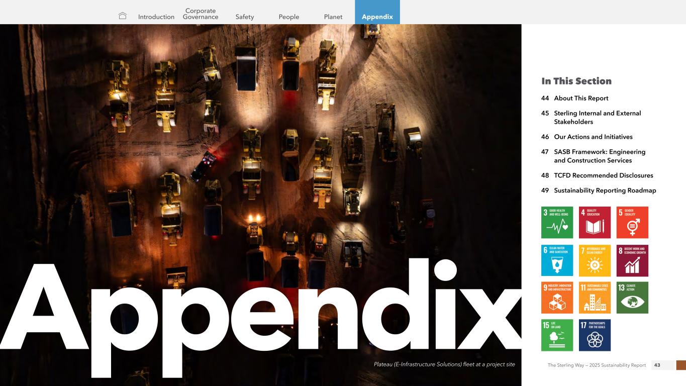 Plateau (E-Infrastructure Solutions) fleet at a project site The Sterling Way — 2025 Sustainability Report 43 Appendix In This Section 44 About This Report 45 Sterling Internal and External Stakeholders 46 Our Actions and Initiatives 47 SASB Framework: Engineering and Construction Services 48 TCFD Recommended Disclosures 49 Sustainability Reporting Roadmap Introduction Corporate Governance Safety People Planet Appendix