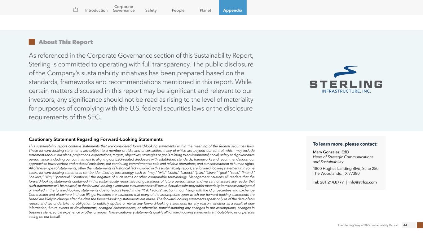 The Sterling Way — 2025 Sustainability Report 44 Introduction Safety Corporate Governance People AppendixPlanet As referenced in the Corporate Governance section of this Sustainability Report, Sterling is committed to operating with full transparency. The public disclosure of the Company’s sustainability initiatives has been prepared based on the standards, frameworks and recommendations mentioned in this report. While certain matters discussed in this report may be significant and relevant to our investors, any significance should not be read as rising to the level of materiality for purposes of complying with the U.S. federal securities laws or the disclosure requirements of the SEC. Cautionary Statement Regarding Forward-Looking Statements This sustainability report contains statements that are considered forward-looking statements within the meaning of the federal securities laws. These forward-looking statements are subject to a number of risks and uncertainties, many of which are beyond our control, which may include statements about: our plans, projections, expectations, targets, objectives, strategies or goals relating to environmental, social, safety and governance performance, including our commitment to aligning our ESG-related disclosure with established standards, frameworks and recommendations; our approach to lower carbon and reduced emissions; our continuing commitment to safe and reliable operations; and our commitment to human rights. All of these types of statements, other than statements of historical fact included in this sustainability report, are forward-looking statements. In some cases, forward-looking statements can be identified by terminology such as “may,” “will,” “could,” “expect,” “plan,” “strive,” “goal,” “seek,” “intend,” “believe,” “aim,” “potential,” “continue,” the negative of such terms or other comparable terminology. Management cautions all readers that the forward-looking statements contained in this sustainability report are not guarantees of future performance, and we cannot assure any reader that such statements will be realized, or the forward-looking events and circumstances will occur. Actual results may differ materially from those anticipated or implied in the forward-looking statements due to factors listed in the “Risk Factors” section in our filings with the U.S. Securities and Exchange Commission and elsewhere in those filings. Investors are cautioned that many of the assumptions upon which our forward-looking statements are based are likely to change after the date the forward-looking statements are made. The forward-looking statements speak only as of the date of this report, and we undertake no obligation to publicly update or revise any forward-looking statements for any reason, whether as a result of new information, future events or developments, changed circumstances, or otherwise, notwithstanding any changes in our assumptions, changes in business plans, actual experience or other changes. These cautionary statements qualify all forward-looking statements attributable to us or persons acting on our behalf. About This Report To learn more, please contact: Mary Gonzalez, EdD Head of Strategic Communications and Sustainability 1800 Hughes Landing Blvd, Suite 250 The Woodlands, TX 77380 Tel: 281.214.0777 | info@strlco.com