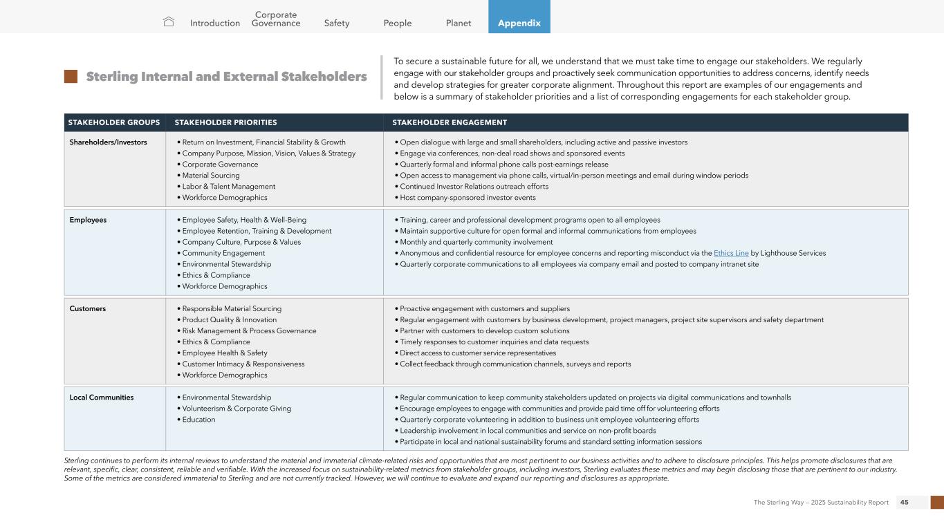 The Sterling Way — 2025 Sustainability Report 45 To secure a sustainable future for all, we understand that we must take time to engage our stakeholders. We regularly engage with our stakeholder groups and proactively seek communication opportunities to address concerns, identify needs and develop strategies for greater corporate alignment. Throughout this report are examples of our engagements and below is a summary of stakeholder priorities and a list of corresponding engagements for each stakeholder group. Sterling Internal and External Stakeholders Introduction Safety Corporate Governance People AppendixPlanet STAKEHOLDER GROUPS STAKEHOLDER PRIORITIES STAKEHOLDER ENGAGEMENT Shareholders/Investors • Return on Investment, Financial Stability & Growth • Company Purpose, Mission, Vision, Values & Strategy • Corporate Governance • Material Sourcing • Labor & Talent Management • Workforce Demographics • Open dialogue with large and small shareholders, including active and passive investors • Engage via conferences, non-deal road shows and sponsored events • Quarterly formal and informal phone calls post-earnings release • Open access to management via phone calls, virtual/in-person meetings and email during window periods • Continued Investor Relations outreach efforts • Host company-sponsored investor events Employees • Employee Safety, Health & Well-Being • Employee Retention, Training & Development • Company Culture, Purpose & Values • Community Engagement • Environmental Stewardship • Ethics & Compliance • Workforce Demographics • Training, career and professional development programs open to all employees • Maintain supportive culture for open formal and informal communications from employees • Monthly and quarterly community involvement • Anonymous and confidential resource for employee concerns and reporting misconduct via the Ethics Line by Lighthouse Services • Quarterly corporate communications to all employees via company email and posted to company intranet site Customers • Responsible Material Sourcing • Product Quality & Innovation • Risk Management & Process Governance • Ethics & Compliance • Employee Health & Safety • Customer Intimacy & Responsiveness • Workforce Demographics • Proactive engagement with customers and suppliers • Regular engagement with customers by business development, project managers, project site supervisors and safety department • Partner with customers to develop custom solutions • Timely responses to customer inquiries and data requests • Direct access to customer service representatives • Collect feedback through communication channels, surveys and reports Local Communities • Environmental Stewardship • Volunteerism & Corporate Giving • Education • Regular communication to keep community stakeholders updated on projects via digital communications and townhalls • Encourage employees to engage with communities and provide paid time off for volunteering efforts • Quarterly corporate volunteering in addition to business unit employee volunteering efforts • Leadership involvement in local communities and service on non-profit boards • Participate in local and national sustainability forums and standard setting information sessions Sterling continues to perform its internal reviews to understand the material and immaterial climate-related risks and opportunities that are most pertinent to our business activities and to adhere to disclosure principles. This helps promote disclosures that are relevant, specific, clear, consistent, reliable and verifiable. With the increased focus on sustainability-related metrics from stakeholder groups, including investors, Sterling evaluates these metrics and may begin disclosing those that are pertinent to our industry. Some of the metrics are considered immaterial to Sterling and are not currently tracked. However, we will continue to evaluate and expand our reporting and disclosures as appropriate.
