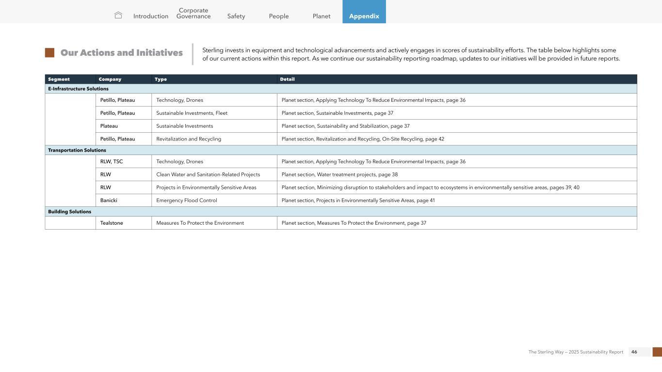 Segment Company Type Detail E-Infrastructure Solutions Petillo, Plateau Technology, Drones Planet section, Applying Technology To Reduce Environmental Impacts, page 36 Petillo, Plateau Sustainable Investments, Fleet Planet section, Sustainable Investments, page 37 Plateau Sustainable Investments Planet section, Sustainability and Stabilization, page 37 Petillo, Plateau Revitalization and Recycling Planet section, Revitalization and Recycling, On-Site Recycling, page 42 Transportation Solutions RLW, TSC Technology, Drones Planet section, Applying Technology To Reduce Environmental Impacts, page 36 RLW Clean Water and Sanitation-Related Projects Planet section, Water treatment projects, page 38 RLW Projects in Environmentally Sensitive Areas Planet section, Minimizing disruption to stakeholders and impact to ecosystems in environmentally sensitive areas, pages 39, 40 Banicki Emergency Flood Control Planet section, Projects in Environmentally Sensitive Areas, page 41 Building Solutions Tealstone Measures To Protect the Environment Planet section, Measures To Protect the Environment, page 37 The Sterling Way — 2025 Sustainability Report 46 Our Actions and Initiatives Sterling invests in equipment and technological advancements and actively engages in scores of sustainability efforts. The table below highlights some of our current actions within this report. As we continue our sustainability reporting roadmap, updates to our initiatives will be provided in future reports. Introduction Safety Corporate Governance People AppendixPlanet