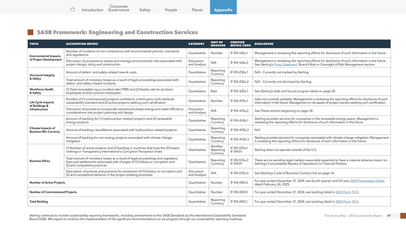 The Sterling Way — 2025 Sustainability Report 47 SASB Framework: Engineering and Construction Services Sterling continues to monitor sustainability reporting frameworks, including amendments to the SASB Standards by the International Sustainability Standards Board (ISSB). We expect to continue the implementation of the significant recommendations as we progress through our sustainability reporting roadmap. Introduction Safety Corporate Governance People AppendixPlanet TOPIC ACCOUNTING METRIC CATEGORY UNIT OF MEASURE CODIFIED METRIC CODE DISCLOSURE Environmental Impacts of Project Development Number of incidents of non-compliance with environmental permits, standards and regulations Quantitative Number IF-EN-160a.1 Management is reviewing the reporting efforts for disclosure of such information in the future. Discussion of processes to assess and manage environmental risks associated with project design, siting and construction Discussion and Analysis N/A IF-EN-160a.2 Management is reviewing the reporting efforts for disclosure of such information in the future. See Sterling’s Proxy Statement, Board’s Role in Oversight of Risk Management section. Structural Integrity & Safety Amount of defect- and safety-related rework costs Quantitative Reporting Currency IF-EN-250a.1 N/A – Currently not tracked by Sterling. Total amount of monetary losses as a result of legal proceedings associated with defect- and safety-related incidents Quantitative Reporting Currency IF-EN-250a.2 N/A – Currently not disclosed by Sterling. Workforce Health & Safety (1) Total recordable injury incident rate (TRIR) and (2) fatality rate for (a) direct employees and (b) contract employees Quantitative Rate IF-EN-320a.1 See Sterling’s Safe and Sound program detail on page 20. Life Cycle Impacts of Buildings & Infrastructure Number of (1) commissioned projects certified to a third-party multi-attribute sustainability standard and (2) active projects seeking such certification Quantitative Number IF-EN-410a.1 Data not currently available. Management is reviewing the reporting efforts for disclosure of such information in the future. Management is not aware of project owners seeking such certification. Discussion of process to incorporate operational-phase energy and water efficiency considerations into project planning and design Discussion and Analysis N/A IF-EN-410a.2 See Planet section beginning on page 34. Climate Impacts of Business Mix Currency Amount of backlog for (1) hydrocarbon-related projects and (2) renewable energy projects Quantitative Reporting Currency IF-EN-410b.1 Sterling provides services for companies in the renewable energy space. Management is reviewing the reporting efforts for disclosure of such information in the future. Amount of backlog cancellations associated with hydrocarbon-related projects Quantitative Reporting Currency IF-EN-410b.2 N/A Amount of backlog for non-energy projects associated with climate change mitigation Quantitative Reporting Currency IF-EN-410b.3 Sterling provides services for companies associated with climate change mitigation. Management is reviewing the reporting efforts for disclosure of such information in the future. Business Ethics (1) Number of active projects and (2) backlog in countries that have the 20 lowest rankings in Transparency International’s Corruption Perception Index Quantitative Number, Reporting Currency IF-EN-510a.1 IF-EN:01 Sterling does not operate outside of the U.S. Total amount of monetary losses as a result of legal proceedings and regulatory fines and settlements associated with charges of (1) bribery or corruption and (2) anti-competitive practices Quantitative Reporting Currency IF-EN-510a.2 IF-EN:01 There are no pending legal matters reasonably expected to have a material adverse impact on Sterling’s Consolidated Results of Operations or Financial Position. Description of policies and practices for prevention of (1) bribery or corruption and (2) anti-competitive behavior in the project bidding processes Discussion and Analysis N/A IF-EN-510a.3 See Sterling’s Code of Business Conduct link on page 16. Number of Active Projects Quantitative Number IF-EN-000.A For year ended December 31, 2024, see fourth quarter and full year 2024 Presentation Slides dated February 26, 2025. Number of Commissioned Projects Quantitative Number IF-EN-000.B For year ended December 31, 2024, see backlog detail in 2024 Form 10-K. Total Backlog Quantitative Reporting Currency IF-EN-000.C For year ended December 31, 2024, see backlog detail in 2024 Form 10-K.