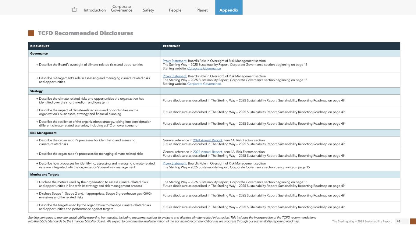The Sterling Way — 2025 Sustainability Report 48 DISCLOSURE REFERENCE Governance + Describe the Board’s oversight of climate-related risks and opportunities Proxy Statement, Board’s Role in Oversight of Risk Management section The Sterling Way — 2025 Sustainability Report, Corporate Governance section beginning on page 15 Sterling website, Corporate Governance + Describe management’s role in assessing and managing climate-related risks and opportunities Proxy Statement, Board’s Role in Oversight of Risk Management section The Sterling Way — 2025 Sustainability Report, Corporate Governance section beginning on page 15 Sterling website, Corporate Governance Strategy + Describe the climate-related risks and opportunities the organization has identified over the short, medium and long term Future disclosure as described in The Sterling Way — 2025 Sustainability Report, Sustainability Reporting Roadmap on page 49 + Describe the impact of climate-related risks and opportunities on the organization’s businesses, strategy and financial planning Future disclosure as described in The Sterling Way — 2025 Sustainability Report, Sustainability Reporting Roadmap on page 49 + Describe the resilience of the organization’s strategy, taking into consideration different climate-related scenarios, including a 2°C or lower scenario Future disclosure as described in The Sterling Way — 2025 Sustainability Report, Sustainability Reporting Roadmap on page 49 Risk Management + Describe the organization’s processes for identifying and assessing climate-related risks General reference in 2024 Annual Report, Item 1A. Risk Factors section Future disclosure as described in The Sterling Way — 2025 Sustainability Report, Sustainability Reporting Roadmap on page 49 + Describe the organization’s processes for managing climate-related risks General reference in 2024 Annual Report, Item 1A. Risk Factors section Future disclosure as described in The Sterling Way — 2025 Sustainability Report, Sustainability Reporting Roadmap on page 49 + Describe how processes for identifying, assessing and managing climate-related risks are integrated into the organization’s overall risk management Proxy Statement, Board’s Role in Oversight of Risk Management section The Sterling Way — 2025 Sustainability Report, Corporate Governance section bewginning on page 15 Metrics and Targets + Disclose the metrics used by the organization to assess climate-related risks and opportunities in line with its strategy and risk management process The Sterling Way — 2025 Sustainability Report, Corporate Governance section beginning on page 15 Future disclosure as described in The Sterling Way — 2025 Sustainability Report, Sustainability Reporting Roadmap on page 49 + Disclose Scope 1, Scope 2 and, if appropriate, Scope 3 greenhouse gas (GHG) emissions and the related risks Future disclosure as described in The Sterling Way — 2025 Sustainability Report, Sustainability Reporting Roadmap on page 49 + Describe the targets used by the organization to manage climate-related risks and opportunities and performance against targets Future disclosure as described in The Sterling Way — 2025 Sustainability Report, Sustainability Reporting Roadmap on page 49 TCFD Recommended Disclosures Sterling continues to monitor sustainability reporting frameworks, including recommendations to evaluate and disclose climate-related information. This includes the incorporation of the TCFD recommendations into the ISSB’s Standards by the Financial Stability Board. We expect to continue the implementation of the significant recommendations as we progress through our sustainability reporting roadmap. Introduction Safety Corporate Governance People AppendixPlanet