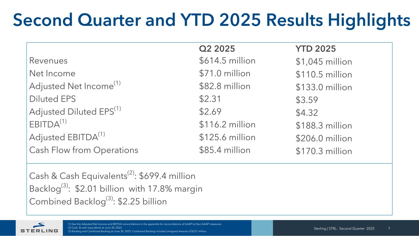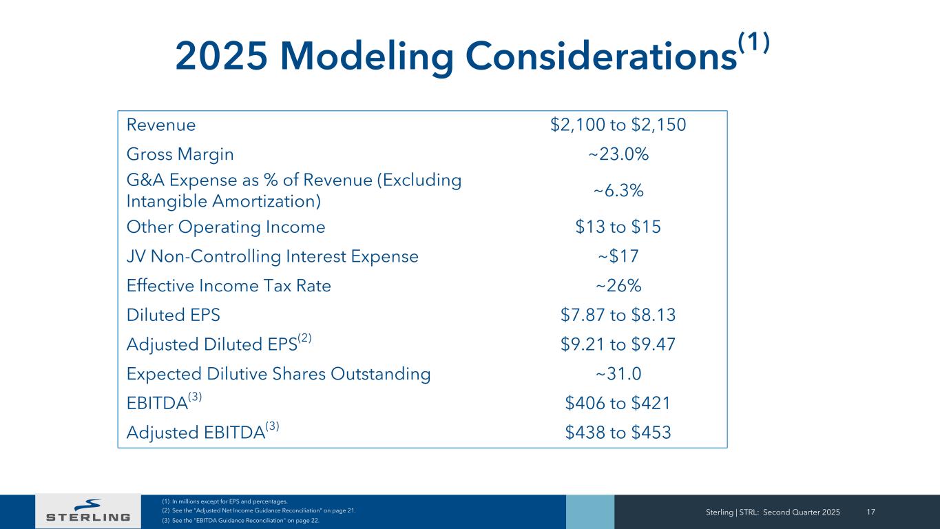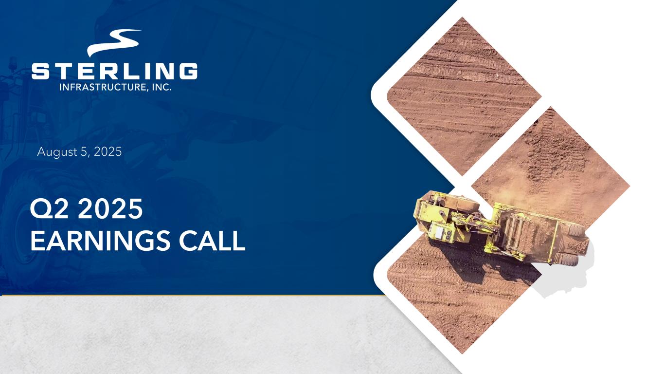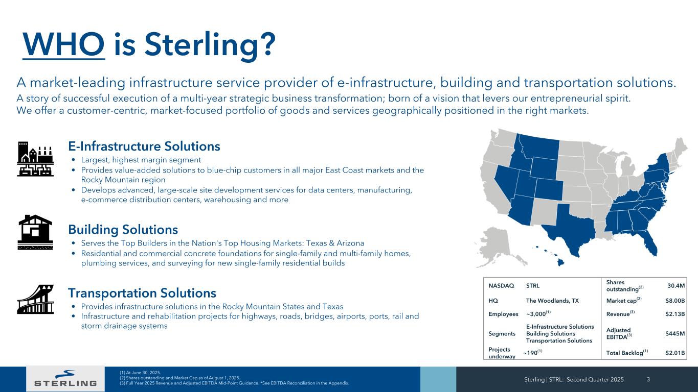 2Sterling | STRL: Second Quarter 2025 DISCLOSURE: Forward-Looking Statements This presentation contains, and the officers and directors of the Company may from time to time make, statements that are considered forward- looking statements within the meaning of the Securities Act of 1933 and the Securities Exchange Act of 1934. These forward-looking statements are subject to a number of risks and uncertainties, many of which are beyond our control, which may include statements about: our business strategy; our financial strategy; our industry outlook; our guidance; our expected margin growth; and our plans, objectives, expectations, forecasts, outlook and intentions. All of these types of statements, other than statements of historical fact included in this presentation, are forward-looking statements. In some cases, forward-looking statements can be identified by terminology such as “may,” “will,” “could,” "would," “should,” “expect,” “plan,” “project,” “intend,” “anticipate,” “believe,” “estimate,” “predict,” “potential,” “pursue,” “target,” "guidance," “continue,” the negative of such terms or other comparable terminology. The forward-looking statements contained in this presentation are largely based on our expectations, which reflect estimates and assumptions made by our management. These estimates and assumptions reflect our best judgment based on currently known market conditions and other factors. Although we believe such estimates and assumptions to be reasonable, they are inherently uncertain and involve a number of risks and uncertainties that are beyond our control. In addition, management’s assumptions about future events may prove to be inaccurate. Management cautions all readers that the forward-looking statements contained in this presentation are not guarantees of future performance, and we cannot assure any reader that such statements will be realized or the forward- looking events and circumstances will occur. Actual results may differ materially from those anticipated or implied in the forward-looking statements due to factors listed in the “Risk Factors” section in our filings with the U.S. Securities and Exchange Commission and elsewhere in those filings. Additional factors or risks that we currently deem immaterial, that are not presently known to us or that arise in the future could also cause our actual results to differ materially from our expected results. Given these uncertainties, investors are cautioned that many of the assumptions upon which our forward-looking statements are based are likely to change after the date the forward-looking statements are made. The forward-looking statements speak only as of the date made, and we undertake no obligation to publicly update or revise any forward- looking statements for any reason, whether as a result of new information, future events or developments, changed circumstances, or otherwise, notwithstanding any changes in our assumptions, changes in business plans, actual experience or other changes. These cautionary statements qualify all forward-looking statements attributable to us or persons acting on our behalf. This presentation may contain the financial measures: adjusted net income, adjusted operating income, EBITDA, adjusted EBITDA, and adjusted EPS, which are not calculated in accordance with U.S. GAAP. When presented, a reconciliation of the non-GAAP financial measures to the most directly comparable GAAP financial measure will be provided in the Appendix to this presentation.