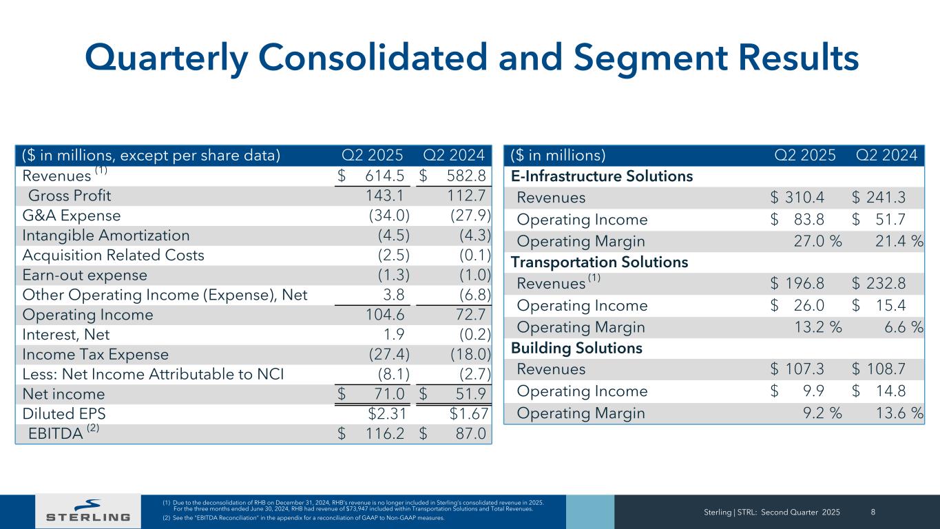 Sterling | STRL: Second Quarter 2025 7 Second Quarter and YTD 2025 Results Highlights Q2 2025 YTD 2025 Revenues $614.5 million $1,045 million Net Income $71.0 million $110.5 million Adjusted Net Income(1) $82.8 million $133.0 million Diluted EPS $2.31 $3.59 Adjusted Diluted EPS(1) $2.69 $4.32 EBITDA(1) $116.2 million $188.3 million Adjusted EBITDA(1) $125.6 million $206.0 million Cash Flow from Operations $85.4 million $170.3 million Cash & Cash Equivalents(2): $699.4 million Backlog(3): $2.01 billion with 17.8% margin Combined Backlog(3): $2.25 billion (1) See the Adjusted Net Income and EBITDA reconciliations in the appendix for reconciliations of GAAP to Non-GAAP measures. (2) Cash & cash equivalents at June 30, 2025. (3) Backlog and Combined Backlog at June 30, 2025. Combined Backlog includes Unsigned Awards of $237 million.
