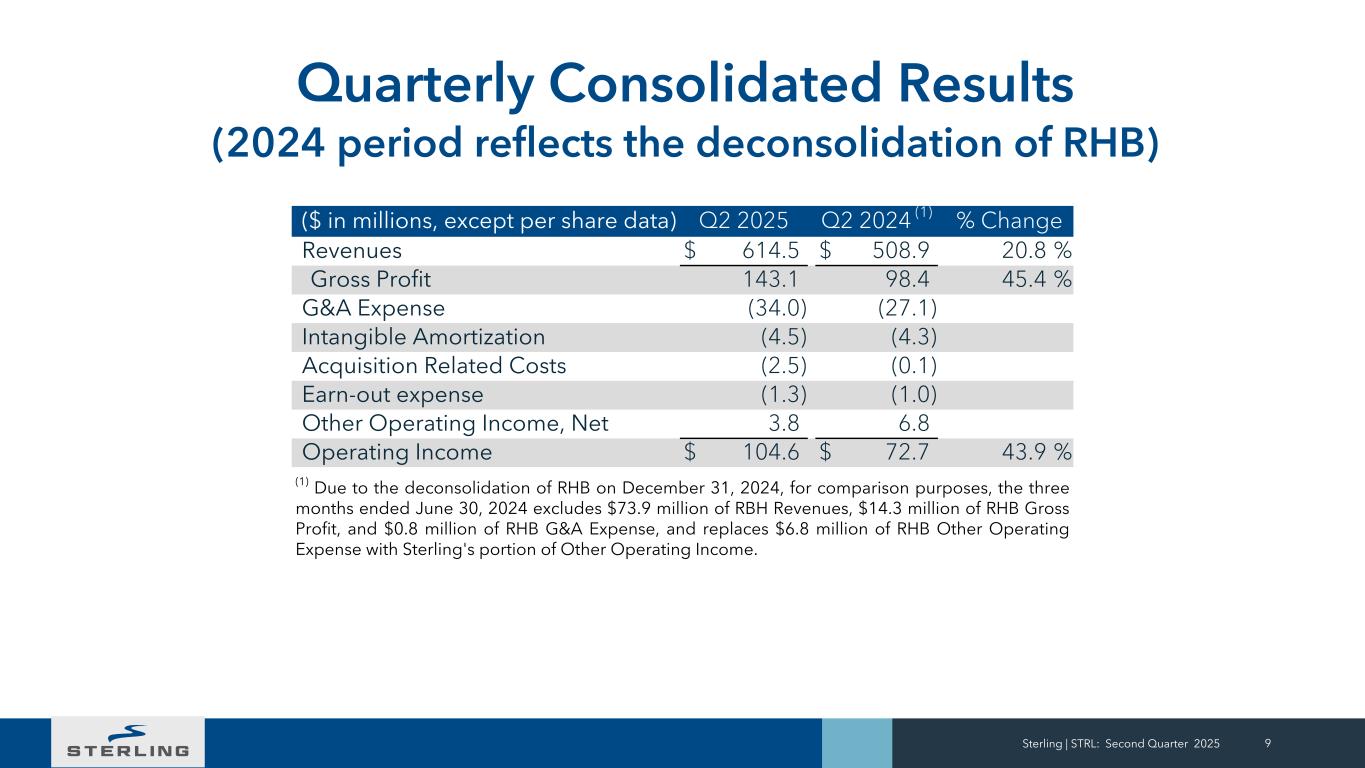 Sterling | STRL: Second Quarter 2025 8 Quarterly Consolidated and Segment Results ($ in millions, except per share data) Q2 2025 Q2 2024 Revenues (1) $ 614.5 $ 582.8 Gross Profit 143.1 112.7 G&A Expense (34.0) (27.9) Intangible Amortization (4.5) (4.3) Acquisition Related Costs (2.5) (0.1) Earn-out expense (1.3) (1.0) Other Operating Income (Expense), Net 3.8 (6.8) Operating Income 104.6 72.7 Interest, Net 1.9 (0.2) Income Tax Expense (27.4) (18.0) Less: Net Income Attributable to NCI (8.1) (2.7) Net income $ 71.0 $ 51.9 Diluted EPS $2.31 $1.67 EBITDA (2) $ 116.2 $ 87.0 ($ in millions) Q2 2025 Q2 2024 E-Infrastructure Solutions Revenues $ 310.4 $ 241.3 Operating Income $ 83.8 $ 51.7 Operating Margin 27.0 % 21.4 % Transportation Solutions Revenues (1) $ 196.8 $ 232.8 Operating Income $ 26.0 $ 15.4 Operating Margin 13.2 % 6.6 % Building Solutions Revenues $ 107.3 $ 108.7 Operating Income $ 9.9 $ 14.8 Operating Margin 9.2 % 13.6 % (1) Due to the deconsolidation of RHB on December 31, 2024, RHB’s revenue is no longer included in Sterling’s consolidated revenue in 2025. For the three months ended June 30, 2024, RHB had revenue of $73,947 included within Transportation Solutions and Total Revenues. (2) See the "EBITDA Reconciliation" in the appendix for a reconciliation of GAAP to Non-GAAP measures.
