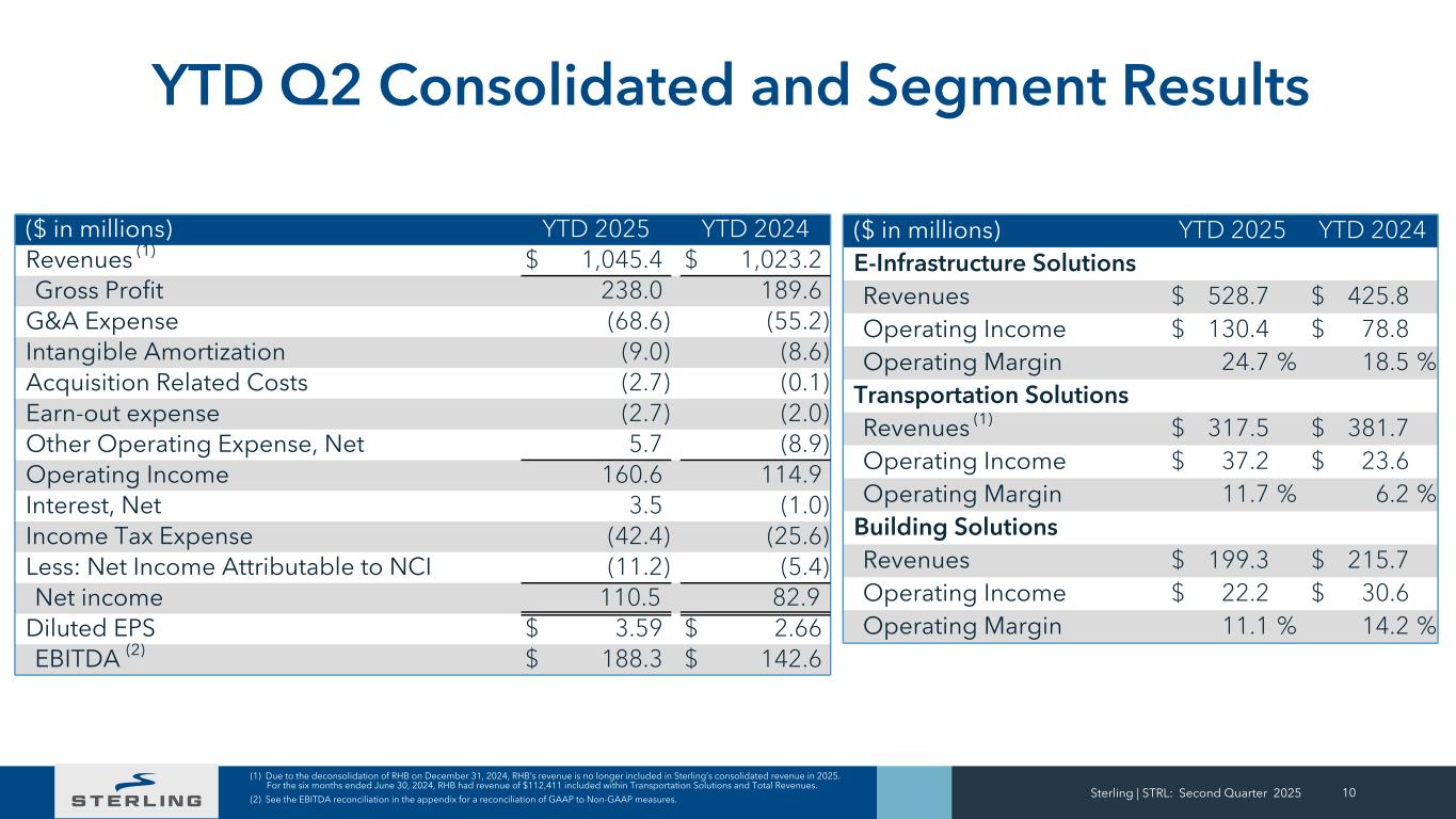 Sterling | STRL: Second Quarter 2025 9 Quarterly Consolidated Results (2024 period reflects the deconsolidation of RHB) ($ in millions, except per share data) Q2 2025 Q2 2024 (1) % Change Revenues $ 614.5 $ 508.9 20.8 % Gross Profit 143.1 98.4 45.4 % G&A Expense (34.0) (27.1) Intangible Amortization (4.5) (4.3) Acquisition Related Costs (2.5) (0.1) Earn-out expense (1.3) (1.0) Other Operating Income, Net 3.8 6.8 Operating Income $ 104.6 $ 72.7 43.9 % (1) Due to the deconsolidation of RHB on December 31, 2024, for comparison purposes, the three months ended June 30, 2024 excludes $73.9 million of RBH Revenues, $14.3 million of RHB Gross Profit, and $0.8 million of RHB G&A Expense, and replaces $6.8 million of RHB Other Operating Expense with Sterling's portion of Other Operating Income.