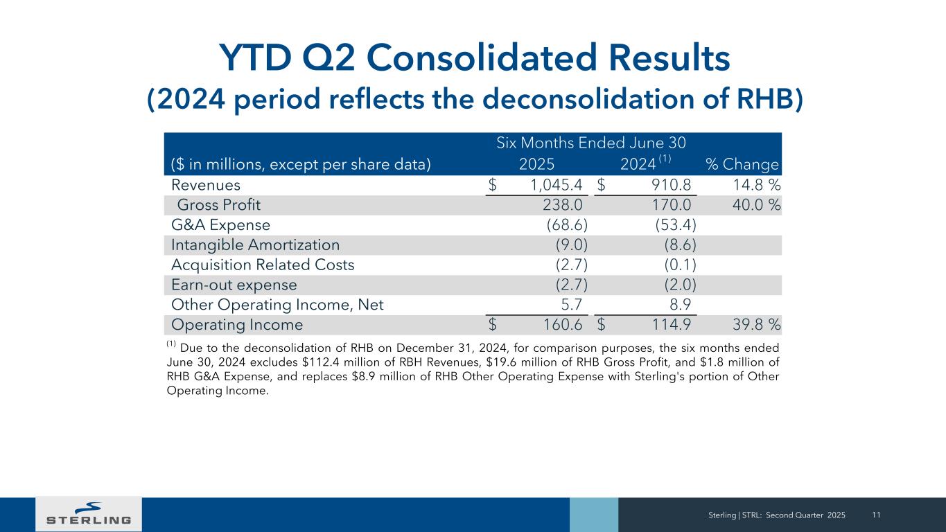Sterling | STRL: Second Quarter 2025 10 YTD Q2 Consolidated and Segment Results ($ in millions) YTD 2025 YTD 2024 Revenues (1) $ 1,045.4 $ 1,023.2 Gross Profit 238.0 189.6 G&A Expense (68.6) (55.2) Intangible Amortization (9.0) (8.6) Acquisition Related Costs (2.7) (0.1) Earn-out expense (2.7) (2.0) Other Operating Expense, Net 5.7 (8.9) Operating Income 160.6 114.9 Interest, Net 3.5 (1.0) Income Tax Expense (42.4) (25.6) Less: Net Income Attributable to NCI (11.2) (5.4) Net income 110.5 82.9 Diluted EPS $ 3.59 $ 2.66 EBITDA (2) $ 188.3 $ 142.6 ($ in millions) YTD 2025 YTD 2024 E-Infrastructure Solutions Revenues $ 528.7 $ 425.8 Operating Income $ 130.4 $ 78.8 Operating Margin 24.7 % 18.5 % Transportation Solutions Revenues (1) $ 317.5 $ 381.7 Operating Income $ 37.2 $ 23.6 Operating Margin 11.7 % 6.2 % Building Solutions Revenues $ 199.3 $ 215.7 Operating Income $ 22.2 $ 30.6 Operating Margin 11.1 % 14.2 % (1) Due to the deconsolidation of RHB on December 31, 2024, RHB’s revenue is no longer included in Sterling’s consolidated revenue in 2025. For the six months ended June 30, 2024, RHB had revenue of $112,411 included within Transportation Solutions and Total Revenues. (2) See the EBITDA reconciliation in the appendix for a reconciliation of GAAP to Non-GAAP measures.