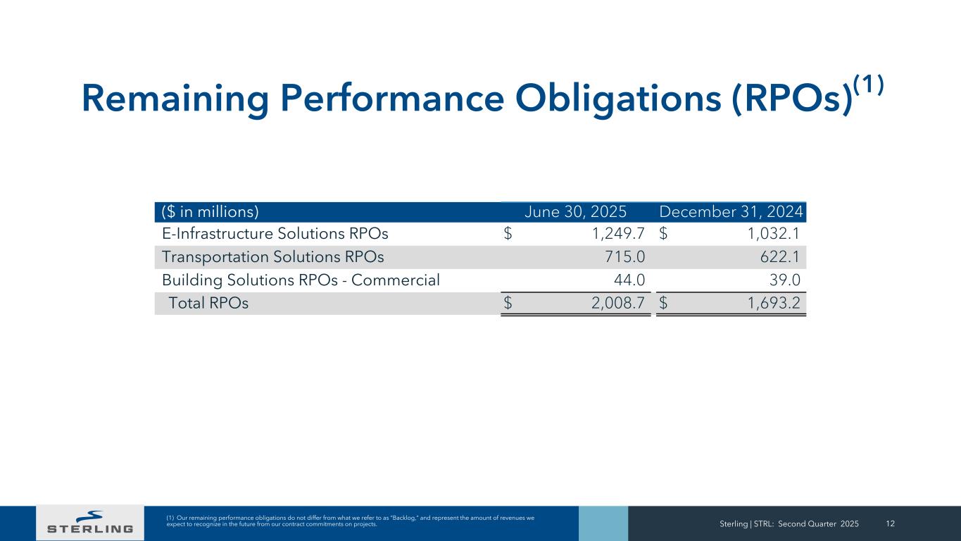 Sterling | STRL: Second Quarter 2025 12 Remaining Performance Obligations (RPOs)(1) ($ in millions) June 30, 2025 December 31, 2024 E-Infrastructure Solutions RPOs $ 1,249.7 $ 1,032.1 Transportation Solutions RPOs 715.0 622.1 Building Solutions RPOs - Commercial 44.0 39.0 Total RPOs $ 2,008.7 $ 1,693.2 (1) Our remaining performance obligations do not differ from what we refer to as “Backlog,” and represent the amount of revenues we expect to recognize in the future from our contract commitments on projects.