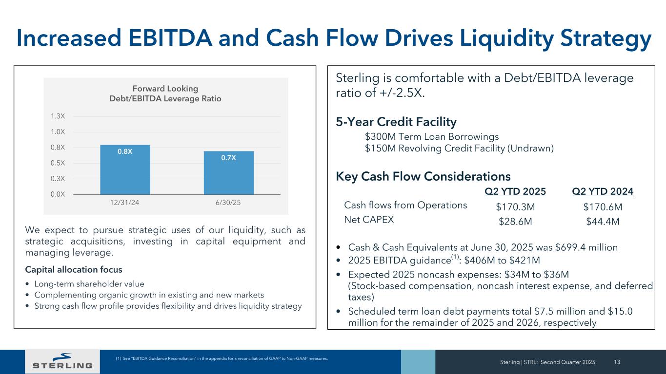 Sterling | STRL: Second Quarter 2025 13 Increased EBITDA and Cash Flow Drives Liquidity Strategy Forward Looking Debt/EBITDA Leverage Ratio 0.8X 0.7X 12/31/24 6/30/25 0.0X 0.3X 0.5X 0.8X 1.0X 1.3X We expect to pursue strategic uses of our liquidity, such as strategic acquisitions, investing in capital equipment and managing leverage. Capital allocation focus • Long-term shareholder value • Complementing organic growth in existing and new markets • Strong cash flow profile provides flexibility and drives liquidity strategy Sterling is comfortable with a Debt/EBITDA leverage ratio of +/-2.5X. 5-Year Credit Facility $300M Term Loan Borrowings $150M Revolving Credit Facility (Undrawn) Key Cash Flow Considerations Q2 YTD 2025 Q2 YTD 2024 Cash flows from Operations $170.3M $170.6M Net CAPEX $28.6M $44.4M • Cash & Cash Equivalents at June 30, 2025 was $699.4 million • 2025 EBITDA guidance(1): $406M to $421M • Expected 2025 noncash expenses: $34M to $36M (Stock-based compensation, noncash interest expense, and deferred taxes) • Scheduled term loan debt payments total $7.5 million and $15.0 million for the remainder of 2025 and 2026, respectively (1) See "EBITDA Guidance Reconciliation" in the appendix for a reconciliation of GAAP to Non-GAAP measures.