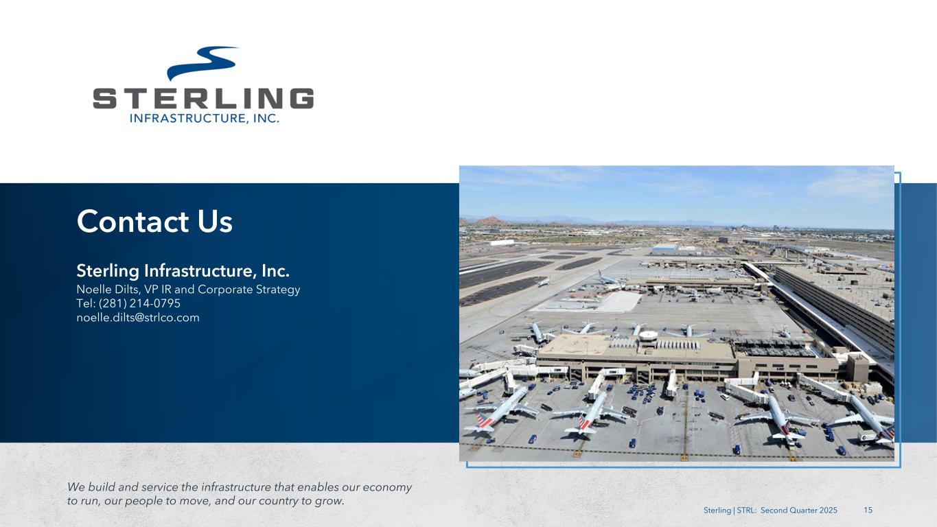We build and service the infrastructure that enables our economy to run, our people to move, and our country to grow. Sterling | STRL: Second Quarter 2025 15 Contact Us Sterling Infrastructure, Inc. Noelle Dilts, VP IR and Corporate Strategy Tel: (281) 214-0795 noelle.dilts@strlco.com