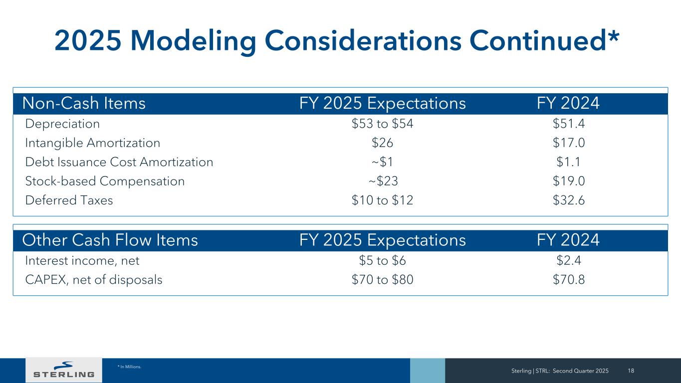 2025 Modeling Considerations Continued* Sterling | STRL: Second Quarter 2025 18 * In Millions. Non-Cash Items FY 2025 Expectations FY 2024 Depreciation $53 to $54 $51.4 Intangible Amortization $26 $17.0 Debt Issuance Cost Amortization ~$1 $1.1 Stock-based Compensation ~$23 $19.0 Deferred Taxes $10 to $12 $32.6 Other Cash Flow Items FY 2025 Expectations FY 2024 Interest income, net $5 to $6 $2.4 CAPEX, net of disposals $70 to $80 $70.8