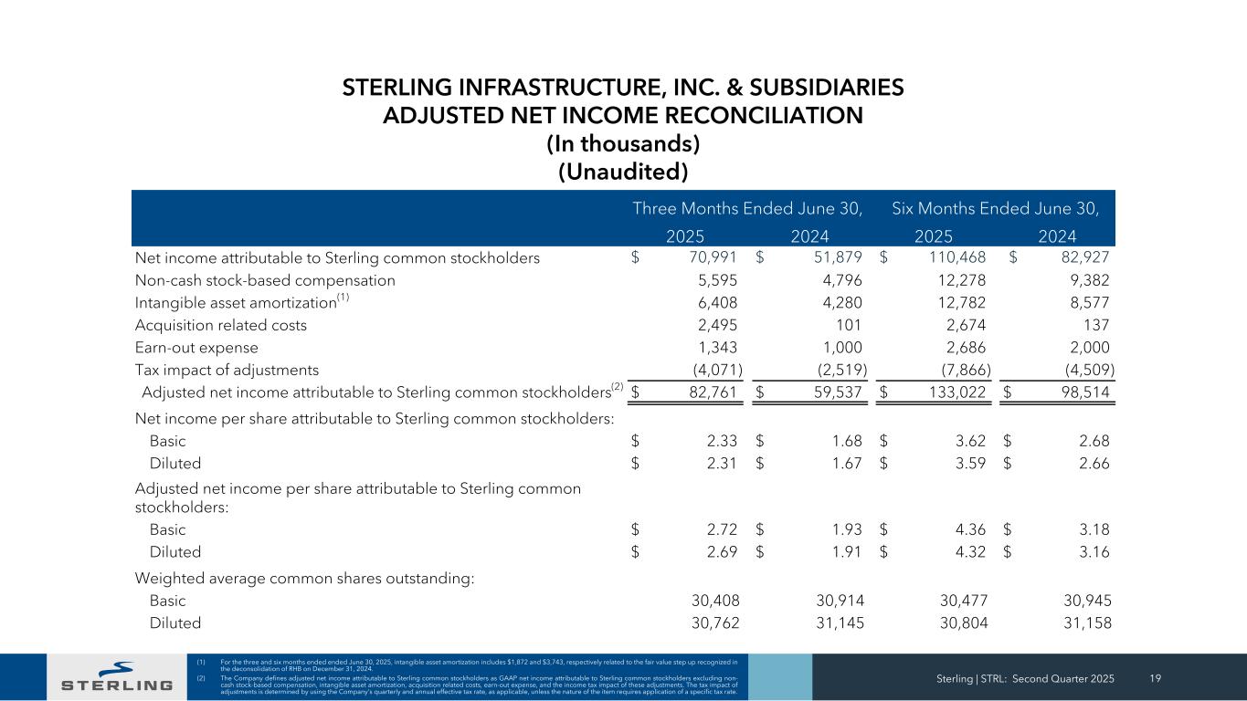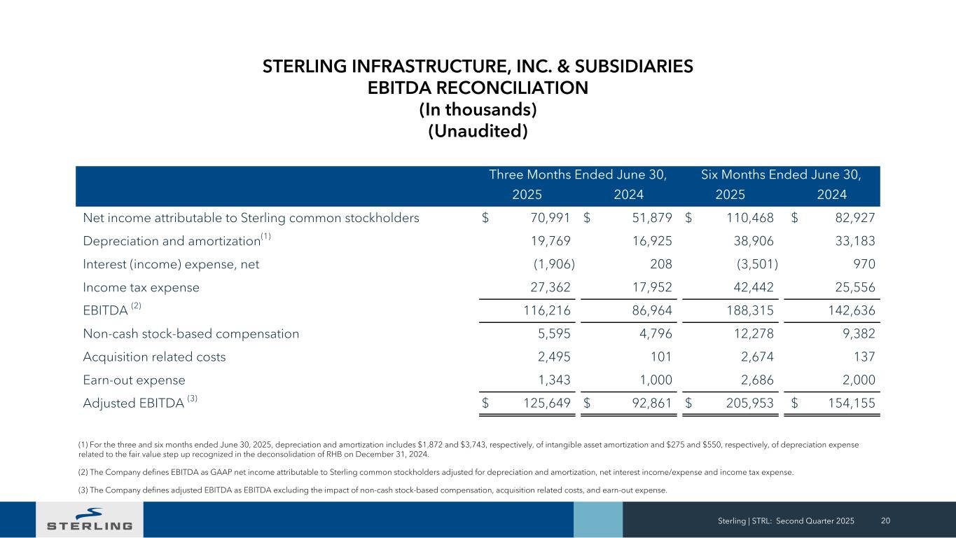 Sterling | STRL: Second Quarter 2025 19 (1) For the three and six months ended ended June 30, 2025, intangible asset amortization includes $1,872 and $3,743, respectively related to the fair value step up recognized in the deconsolidation of RHB on December 31, 2024. (2) The Company defines adjusted net income attributable to Sterling common stockholders as GAAP net income attributable to Sterling common stockholders excluding non- cash stock-based compensation, intangible asset amortization, acquisition related costs, earn-out expense, and the income tax impact of these adjustments. The tax impact of adjustments is determined by using the Company's quarterly and annual effective tax rate, as applicable, unless the nature of the item requires application of a specific tax rate. Three Months Ended June 30, Six Months Ended June 30, 2025 2024 2025 2024 Net income attributable to Sterling common stockholders $ 70,991 $ 51,879 $ 110,468 $ 82,927 Non-cash stock-based compensation 5,595 4,796 12,278 9,382 Intangible asset amortization(1) 6,408 4,280 12,782 8,577 Acquisition related costs 2,495 101 2,674 137 Earn-out expense 1,343 1,000 2,686 2,000 Tax impact of adjustments (4,071) (2,519) (7,866) (4,509) Adjusted net income attributable to Sterling common stockholders(2) $ 82,761 $ 59,537 $ 133,022 $ 98,514 Net income per share attributable to Sterling common stockholders: Basic $ 2.33 $ 1.68 $ 3.62 $ 2.68 Diluted $ 2.31 $ 1.67 $ 3.59 $ 2.66 Adjusted net income per share attributable to Sterling common stockholders: Basic $ 2.72 $ 1.93 $ 4.36 $ 3.18 Diluted $ 2.69 $ 1.91 $ 4.32 $ 3.16 Weighted average common shares outstanding: Basic 30,408 30,914 30,477 30,945 Diluted 30,762 31,145 30,804 31,158 STERLING INFRASTRUCTURE, INC. & SUBSIDIARIES ADJUSTED NET INCOME RECONCILIATION (In thousands) (Unaudited)
