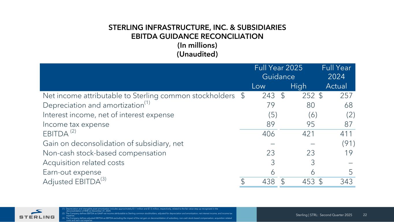 Sterling | STRL: Second Quarter 2025 21 (1) Intangible asset amortization includes approximately $7,500 related to the fair value step up recognized in the deconsolidation of RHB on December 31, 2024. (2) The Company defines adjusted net income attributable to Sterling common stockholders as GAAP net income attributable to Sterling common stockholders excluding the impact of the net gain on deconsolidation of subsidiary, non-cash stock-based compensation, intangible asset amortization, acquisition related costs, earn-out expense, and the income tax impact of these adjustments. The tax impact of adjustments is determined by using the Company's quarterly and annual effective tax rate, as applicable, unless the nature of the item requires application of a specific tax rate. Full Year 2025 Guidance Full Year Low High 2024 Actual Net income attributable to Sterling common stockholders $ 243,000 $ 252,000 $ 257,461 Gain on deconsolidation of subsidiary, net — — (91,289) Non-cash stock-based compensation 23,000 23,000 19,003 Intangible asset amortization(1) 25,633 25,633 17,037 Acquisition related costs 2,674 2,674 421 Earn-out expense 6,000 6,000 4,756 Income tax impact of adjustments (15,000) (15,000) 13,356 Adjusted net income attributable to Sterling common stockholders(2) $ 285,307 $ 294,307 $ 220,745 Net income per share attributable to Sterling common stockholders: Diluted $ 7.87 $ 8.13 $ 8.27 Adjusted net income per share attributable to Sterling common stockholders: Diluted $ 9.21 $ 9.47 $ 7.09 Weighted average common shares outstanding: Diluted 31,000 31,000 31,146 STERLING INFRASTRUCTURE, INC. & SUBSIDIARIES ADJUSTED NET INCOME GUIDANCE RECONCILIATION (In thousands) (Unaudited)