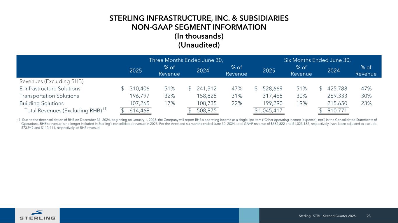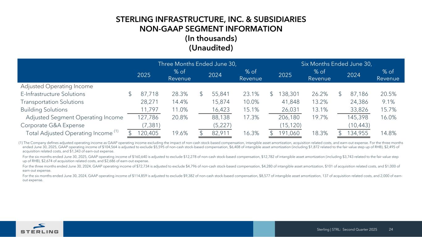 Sterling | STRL: Second Quarter 2025 23 Three Months Ended June 30, Six Months Ended June 30, 2025 % of Revenue 2024 % of Revenue 2025 % of Revenue 2024 % of Revenue Revenues (Excluding RHB) E-Infrastructure Solutions $ 310,406 51% $ 241,312 47% $ 528,669 51% $ 425,788 47% Transportation Solutions 196,797 32% 158,828 31% 317,458 30% 269,333 30% Building Solutions 107,265 17% 108,735 22% 199,290 19% 215,650 23% Total Revenues (Excluding RHB) (1) $ 614,468 $ 508,875 $ 1,045,417 $ 910,771 (1) Due to the deconsolidation of RHB on December 31, 2024, beginning on January 1, 2025, the Company will report RHB’s operating income as a single line item (“Other operating income (expense), net”) in the Consolidated Statements of Operations. RHB’s revenue is no longer included in Sterling’s consolidated revenue in 2025. For the three and six months ended June 30, 2024, total GAAP revenue of $582,822 and $1,023,182, respectively, have been adjusted to exclude $73,947 and $112,411, respectively, of RHB revenue. STERLING INFRASTRUCTURE, INC. & SUBSIDIARIES NON-GAAP SEGMENT INFORMATION (In thousands) (Unaudited)