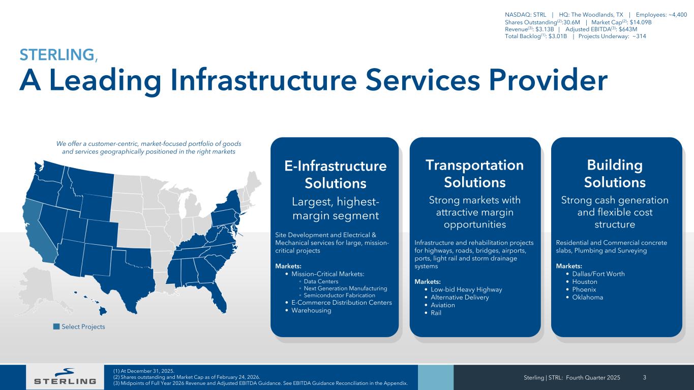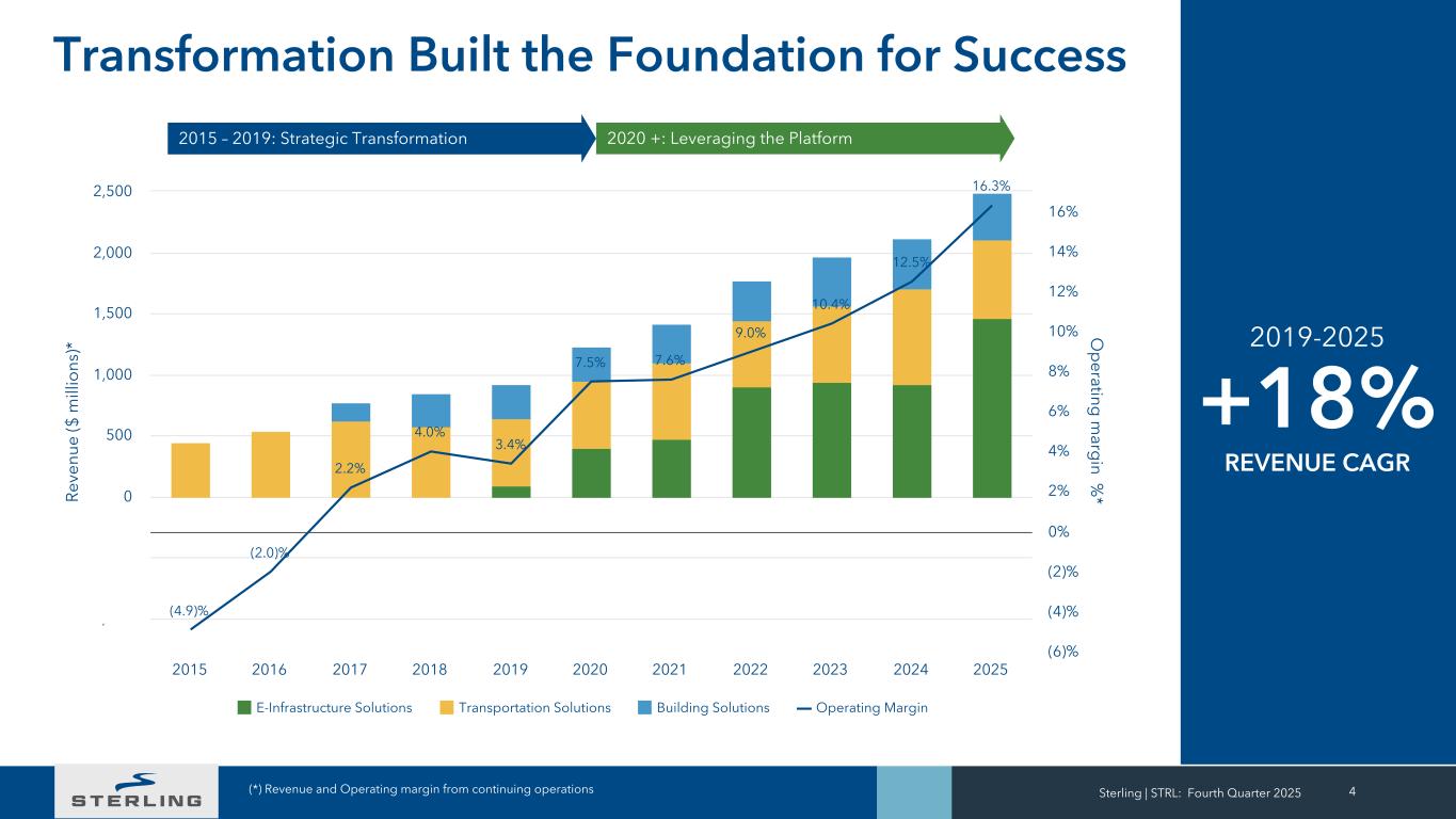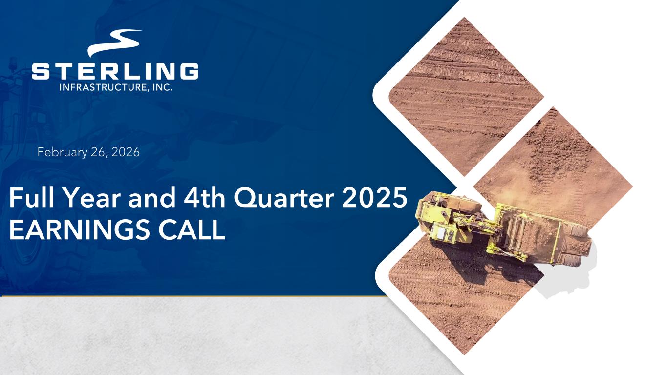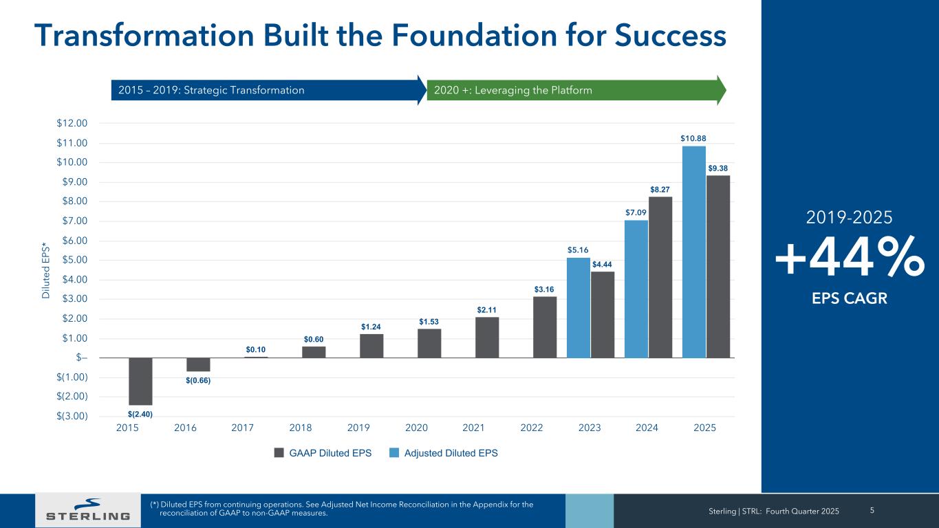 2Sterling | STRL: Fourth Quarter 2025 DISCLOSURE: Forward-Looking Statements This presentation contains, and the officers and directors of the Company may from time to time make, statements that are considered forward- looking statements within the meaning of the Securities Act of 1933 and the Securities Exchange Act of 1934. These forward-looking statements are subject to a number of risks and uncertainties, many of which are beyond our control, which may include statements about: the anticipated benefits of the CEC acquisition; our business strategy; our financial strategy; our industry outlook; our guidance; our expected margin growth; our pool of future work; and our plans, objectives, expectations, forecasts, outlook and intentions. All of these types of statements, other than statements of historical fact included in this presentation, are forward-looking statements. In some cases, forward-looking statements can be identified by terminology such as “may,” “will,” “could,” "would," “should,” “expect,” “plan,” “project,” “intend,” “anticipate,” “believe,” “estimate,” “predict,” “potential,” “pursue,” “target,” "guidance," “continue,” the negative of such terms or other comparable terminology. The forward- looking statements contained in this presentation are largely based on our expectations, which reflect estimates and assumptions made by our management. These estimates and assumptions reflect our best judgment based on currently known market conditions and other factors. Although we believe such estimates and assumptions to be reasonable, they are inherently uncertain and involve a number of risks and uncertainties that are beyond our control. In addition, management’s assumptions about future events may prove to be inaccurate. Management cautions all readers that the forward-looking statements contained in this presentation are not guarantees of future performance, and we cannot assure any reader that such statements will be realized or the forward-looking events and circumstances will occur. Actual results may differ materially from those anticipated or implied in the forward-looking statements due to factors listed in the “Risk Factors” section in our filings with the U.S. Securities and Exchange Commission and elsewhere in those filings. Additional factors or risks that we currently deem immaterial, that are not presently known to us or that arise in the future could also cause our actual results to differ materially from our expected results. Given these uncertainties, investors are cautioned that many of the assumptions upon which our forward-looking statements are based are likely to change after the date the forward-looking statements are made. The forward-looking statements speak only as of the date made, and we undertake no obligation to publicly update or revise any forward-looking statements for any reason, whether as a result of new information, future events or developments, changed circumstances, or otherwise, notwithstanding any changes in our assumptions, changes in business plans, actual experience or other changes. These cautionary statements qualify all forward-looking statements attributable to us or persons acting on our behalf. This presentation may contain the financial measures: adjusted net income, adjusted operating income, EBITDA, adjusted EBITDA, and adjusted EPS, which are not calculated in accordance with U.S. GAAP. When presented, a reconciliation of the non-GAAP financial measures to the most directly comparable GAAP financial measure will be provided in the Appendix to this presentation.
