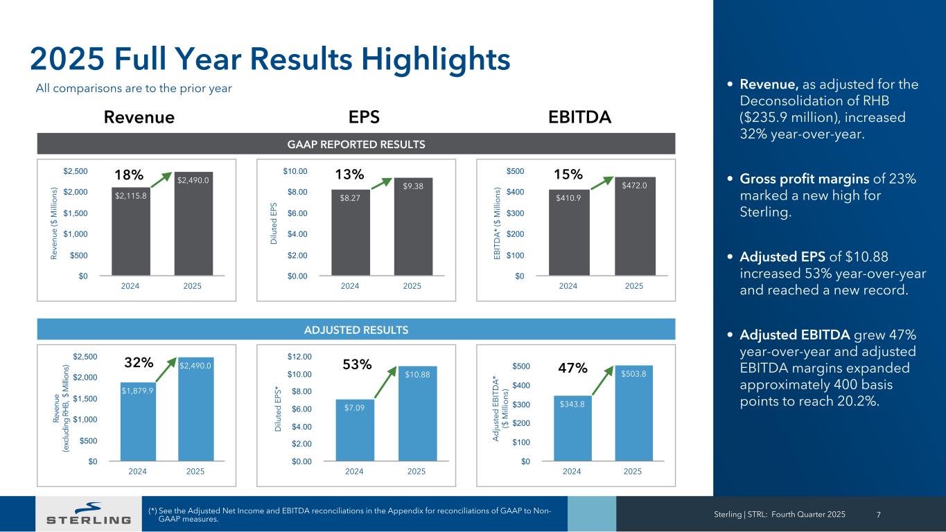 A d ju st ed E B IT D A * ($ M ill io ns ) $83.4 $142.1 Q4 2024 Q4 2025 $0 $25 $50 $75 $100 $125 $150 D ilu te d E PS * $1.73 $3.08 Q4 2024 Q4 2025 $0.00 $0.50 $1.00 $1.50 $2.00 $2.50 $3.00 $3.50 EB IT D A * ($ M ill io ns ) $167.4 $140.6 Q4 2024 Q4 2025 $0 $25 $50 $75 $100 $125 $150 $175 D ilu te d E PS $3.64 $2.81 Q4 2024 Q4 2025 $0.00 $0.50 $1.00 $1.50 $2.00 $2.50 $3.00 $3.50 $4.00 Re ve nu e (e xc lu di ng R H B, $ M ill io ns ) $447.6 $755.6 Q4 2024 Q4 2025 $0 $100 $200 $300 $400 $500 $600 $700 $800 Re ve nu e ($ M ill io ns ) $498.8 $755.6 Q4 2024 Q4 2025 $0 $100 $200 $300 $400 $500 $600 $700 $800 GAAP REPORTED RESULTS All comparisons are to the prior year quarter Fourth Quarter 2025 Results Highlights • Revenue, as adjusted for the Deconsolidation of RHB ($51.3 million), increased 69% year-over-year. Organic growth was 36%. • Gross profit margins of 22% marked a new high for Sterling. • Adjusted EPS of $3.08 increased 78% year-over-year and reached a new record. • Adjusted EBITDA grew 70% year-over-year and adjusted EBITDA margins expanded over 200 basis points to reach 18.8%. (*) See the Adjusted Net Income and EBITDA reconciliations in the Appendix for reconciliations of GAAP to Non- GAAP measures. Sterling | STRL: Fourth Quarter 2025 10 51% 69% 23% 16% 78% 70% Revenue EPS EBITDA ADJUSTED RESULTS