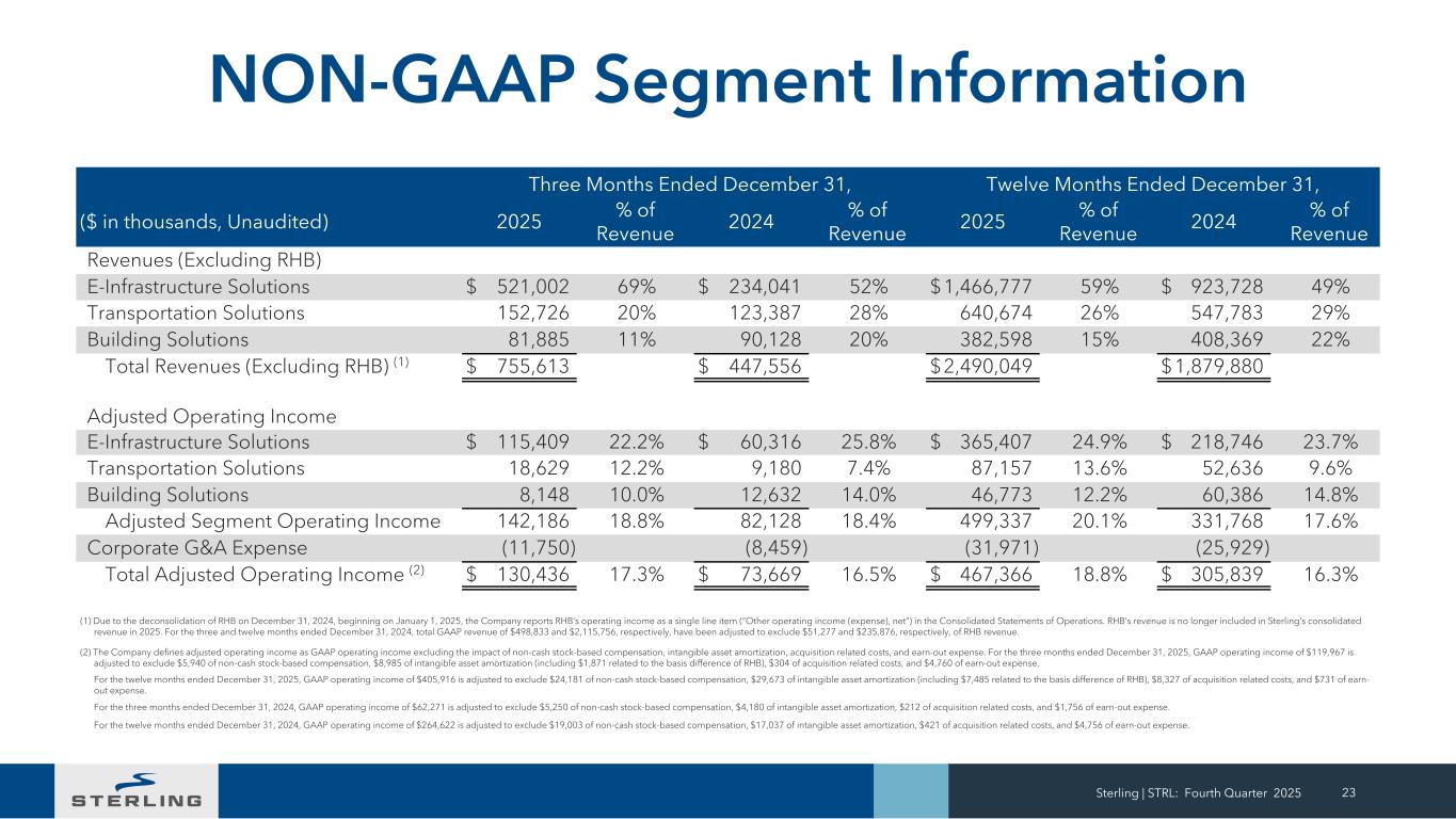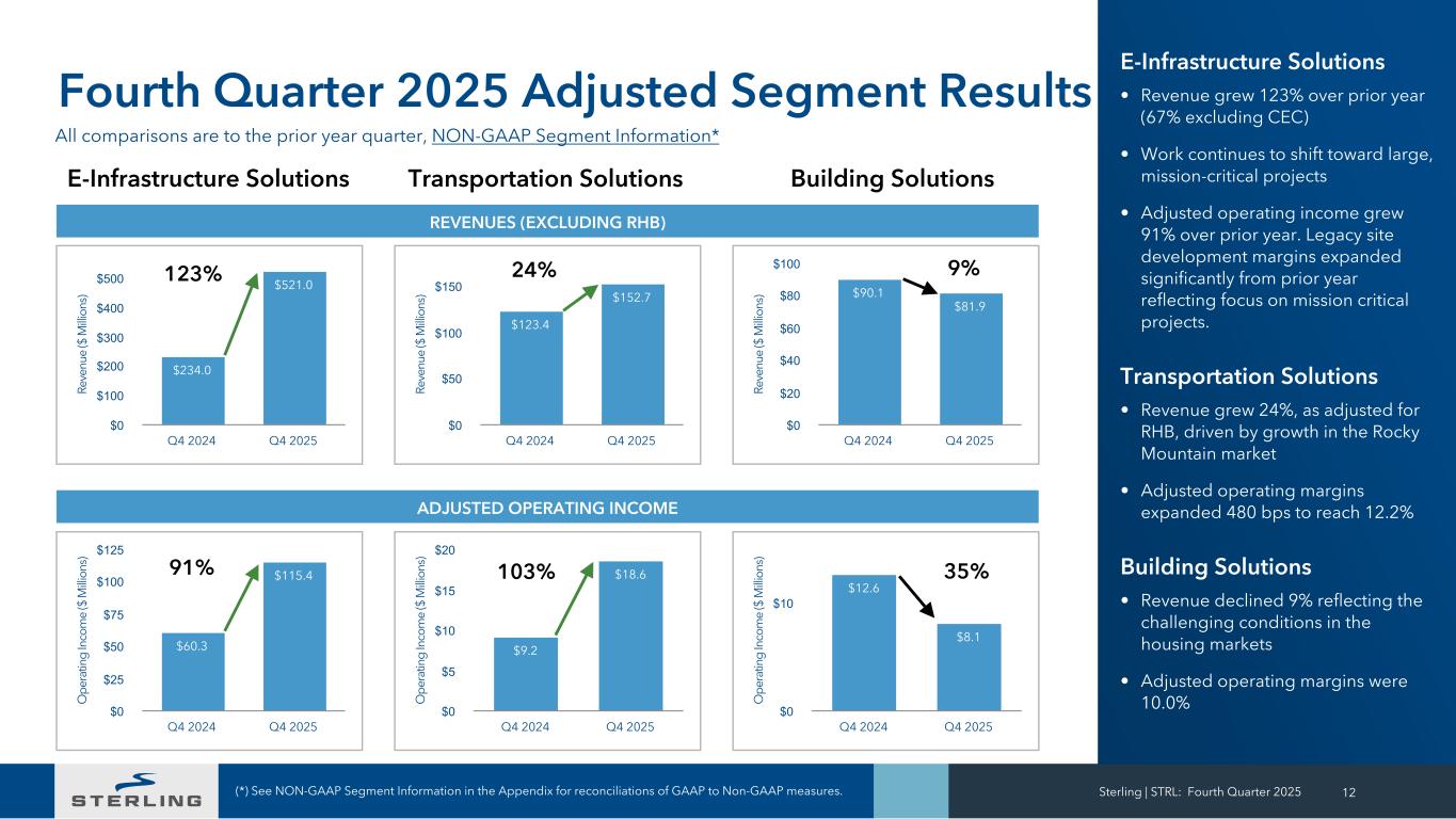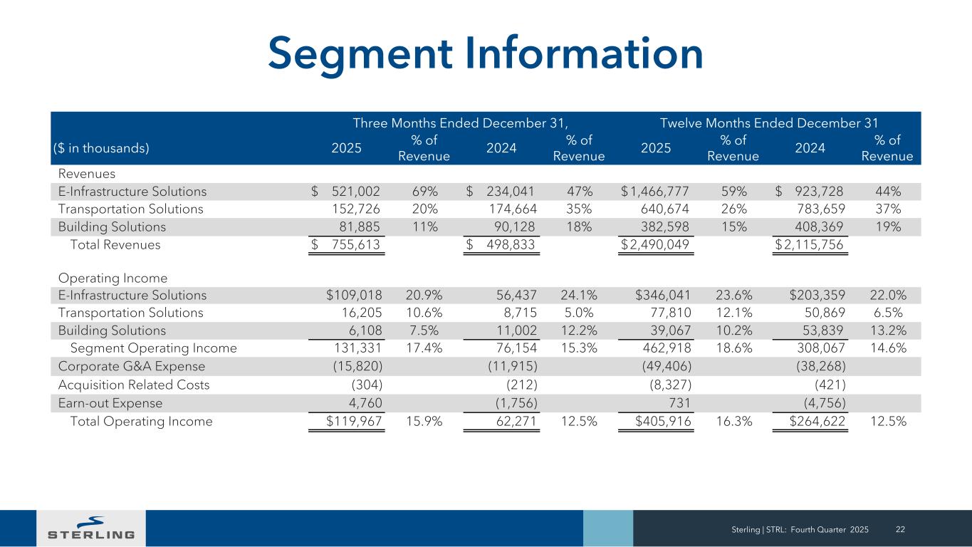 Three Months Ended December 31, Twelve Months Ended December 31 ($ in thousands) 2025 % of Revenue 2024 % of Revenue 2025 % of Revenue 2024 % of Revenue Revenues E-Infrastructure Solutions $ 521,002 69% $ 234,041 47% $ 1,466,777 59% $ 923,728 44% Transportation Solutions 152,726 20% 174,664 35% 640,674 26% 783,659 37% Building Solutions 81,885 11% 90,128 18% 382,598 15% 408,369 19% Total Revenues $ 755,613 $ 498,833 $ 2,490,049 $ 2,115,756 Operating Income E-Infrastructure Solutions $109,018 20.9% 56,437 24.1% $346,041 23.6% $203,359 22.0% Transportation Solutions 16,205 10.6% 8,715 5.0% 77,810 12.1% 50,869 6.5% Building Solutions 6,108 7.5% 11,002 12.2% 39,067 10.2% 53,839 13.2% Segment Operating Income 131,331 17.4% 76,154 15.3% 462,918 18.6% 308,067 14.6% Corporate G&A Expense (15,820) (11,915) (49,406) (38,268) Acquisition Related Costs (304) (212) (8,327) (421) Earn-out Expense 4,760 (1,756) 731 (4,756) Total Operating Income $119,967 15.9% 62,271 12.5% $405,916 16.3% $264,622 12.5% Segment Information Sterling | STRL: Fourth Quarter 2025 22