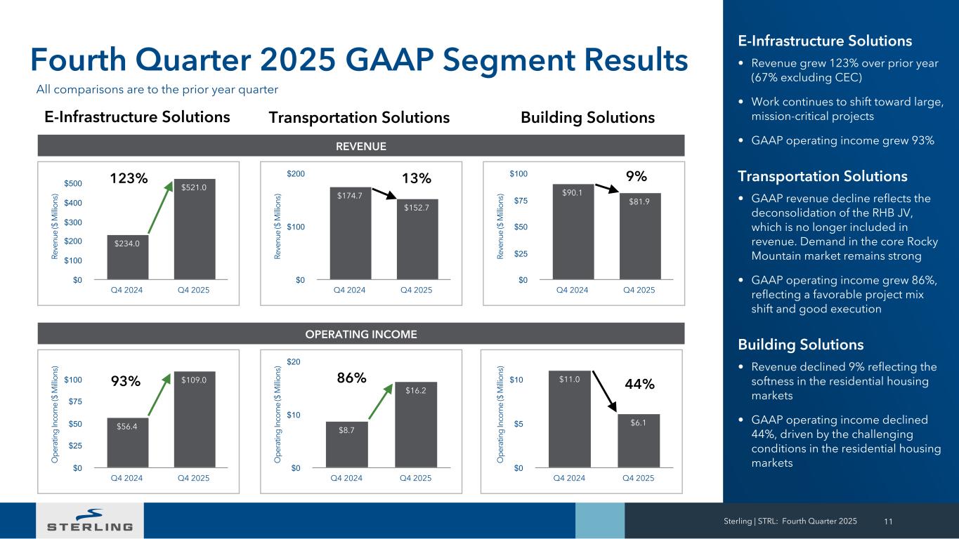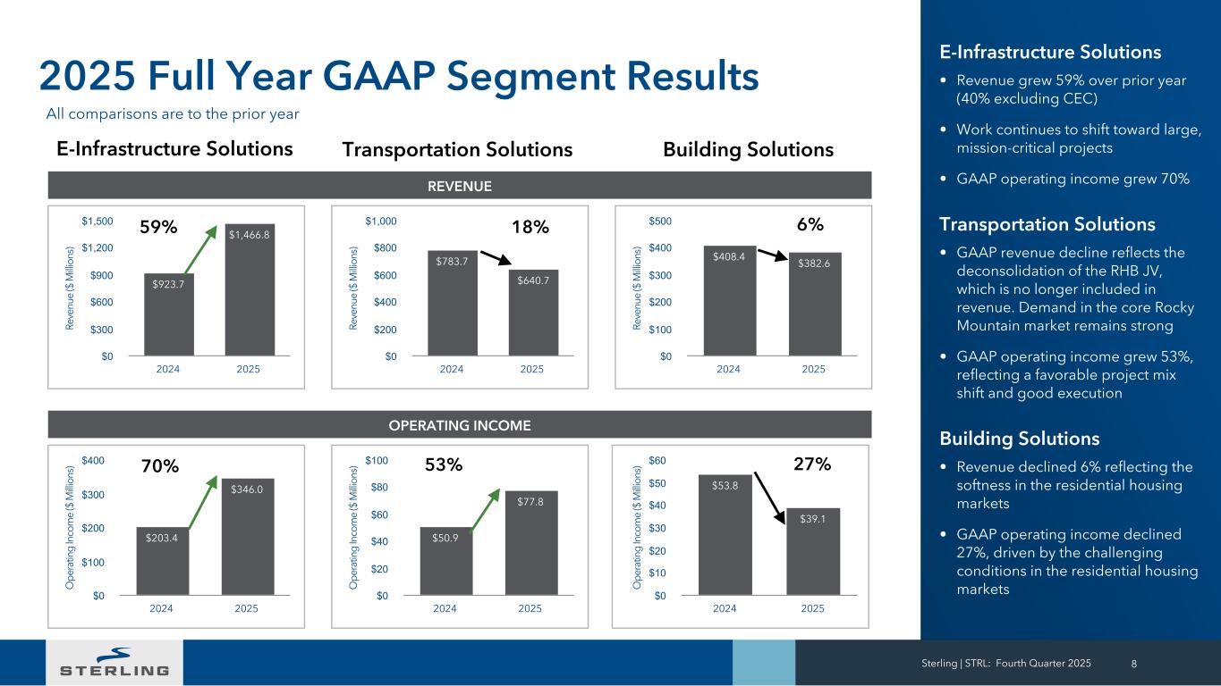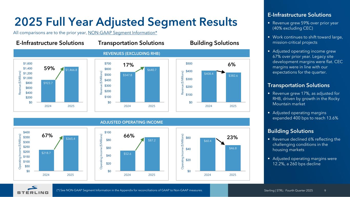 Three Months Ended December 31, Twelve Months Ended December 31 ($ in thousands) 2025 % of Revenue 2024 % of Revenue 2025 % of Revenue 2024 % of Revenue Revenues E-Infrastructure Solutions $ 521,002 69% $ 234,041 47% $ 1,466,777 59% $ 923,728 44% Transportation Solutions 152,726 20% 174,664 35% 640,674 26% 783,659 37% Building Solutions 81,885 11% 90,128 18% 382,598 15% 408,369 19% Total Revenues $ 755,613 $ 498,833 $ 2,490,049 $ 2,115,756 Operating Income E-Infrastructure Solutions $109,018 20.9% 56,437 24.1% $346,041 23.6% $203,359 22.0% Transportation Solutions 16,205 10.6% 8,715 5.0% 77,810 12.1% 50,869 6.5% Building Solutions 6,108 7.5% 11,002 12.2% 39,067 10.2% 53,839 13.2% Segment Operating Income 131,331 17.4% 76,154 15.3% 462,918 18.6% 308,067 14.6% Corporate G&A Expense (15,820) (11,915) (49,406) (38,268) Acquisition Related Costs (304) (212) (8,327) (421) Earn-out Expense 4,760 (1,756) 731 (4,756) Total Operating Income $119,967 15.9% 62,271 12.5% $405,916 16.3% $264,622 12.5% Segment Information Sterling | STRL: Fourth Quarter 2025 22
