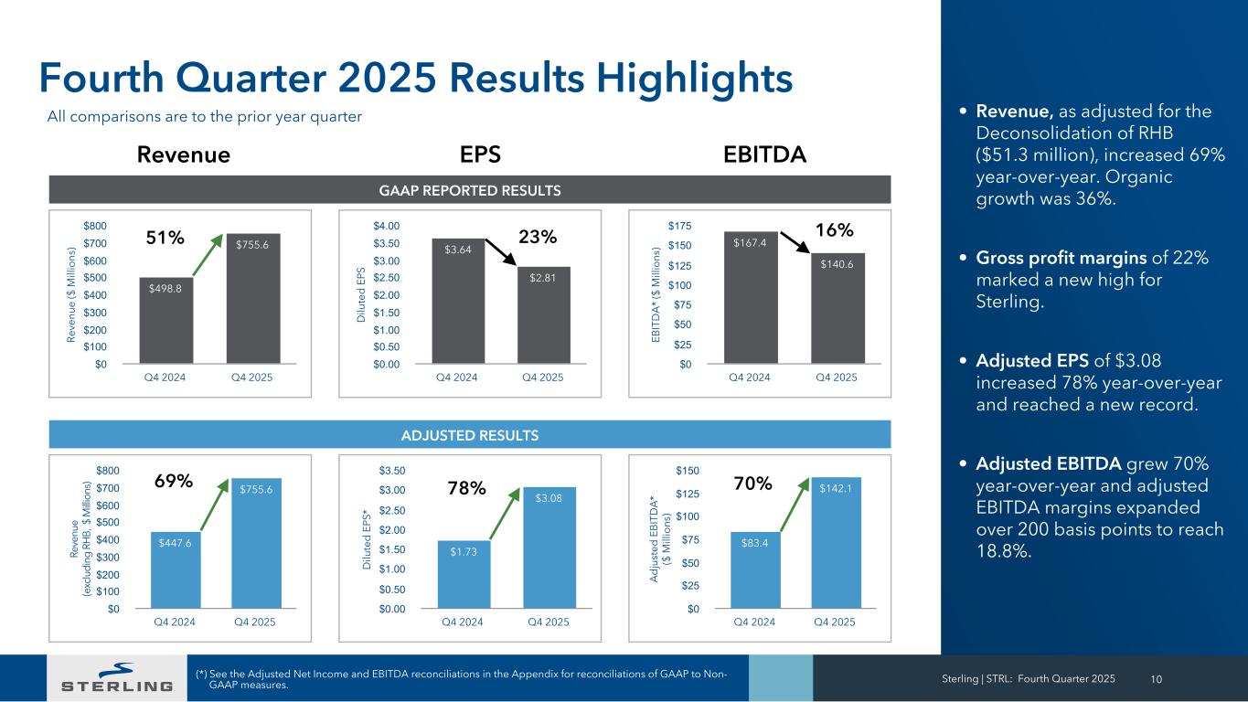O pe ra tin g In co m e ($ M ill io ns ) $218.7 $365.4 2024 2025 $0 $50 $100 $150 $200 $250 $300 $350 $400 O pe ra tin g In co m e ($ M ill io ns ) $60.4 $46.8 2024 2025 $0 $20 $40 $60 O pe ra tin g In co m e ($ M ill io ns ) $52.6 $87.2 2024 2025 $0 $20 $40 $60 $80 $100 Re ve nu e ($ M ill io ns ) $408.4 $382.6 2024 2025 $0 $100 $200 $300 $400 $500 Re ve nu e ($ M ill io ns ) $923.7 $1,466.8 2024 2025 $0 $200 $400 $600 $800 $1,000 $1,200 $1,400 $1,600 Re ve nu e ($ M ill io ns ) $547.8 $640.7 2024 2025 $0 $100 $200 $300 $400 $500 $600 $700 REVENUES (EXCLUDING RHB) ADJUSTED OPERATING INCOME 2025 Full Year Adjusted Segment Results (*) See NON-GAAP Segment Information in the Appendix for reconciliations of GAAP to Non-GAAP measures. Sterling | STRL: Fourth Quarter 2025 9 59% 17% 6% 67% 66% 23% All comparisons are to the prior year, NON-GAAP Segment Information* Building Solutions E-Infrastructure Solutions • Revenue grew 59% over prior year (40% excluding CEC) • Work continues to shift toward large, mission-critical projects • Adjusted operating income grew 67% over prior year. Legacy site development margins were flat. CEC margins were in line with our expectations for the quarter. Transportation Solutions • Revenue grew 17%, as adjusted for RHB, driven by growth in the Rocky Mountain market • Adjusted operating margins expanded 400 bps to reach 13.6% Building Solutions • Revenue declined 6% reflecting the challenging conditions in the housing markets • Adjusted operating margins were 12.2%, a 260 bps decline Transportation SolutionsE-Infrastructure Solutions