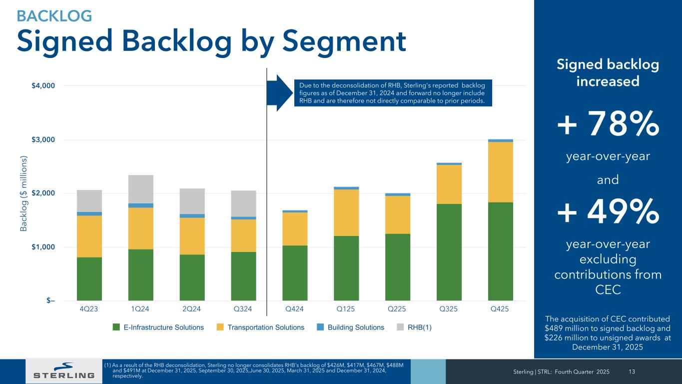 Sterling | STRL: Fourth Quarter 2025 13 (1) As a result of the RHB deconsolidation, Sterling no longer consolidates RHB's backlog of $426M, $417M, $467M, $488M and $491M at December 31, 2025, September 30, 2025,June 30, 2025, March 31, 2025 and December 31, 2024, respectively. B ac kl o g ($ m ill io ns ) E-Infrastructure Solutions Transportation Solutions Building Solutions RHB(1) 4Q23 1Q24 2Q24 Q324 Q424 Q125 Q225 Q325 Q425 $— $1,000 $2,000 $3,000 $4,000 Due to the deconsolidation of RHB, Sterling's reported backlog figures as of December 31, 2024 and forward no longer include RHB and are therefore not directly comparable to prior periods. BACKLOG Signed Backlog by Segment Signed backlog increased + 78% year-over-year and + 49% year-over-year excluding contributions from CEC The acquisition of CEC contributed $489 million to signed backlog and $226 million to unsigned awards at December 31, 2025