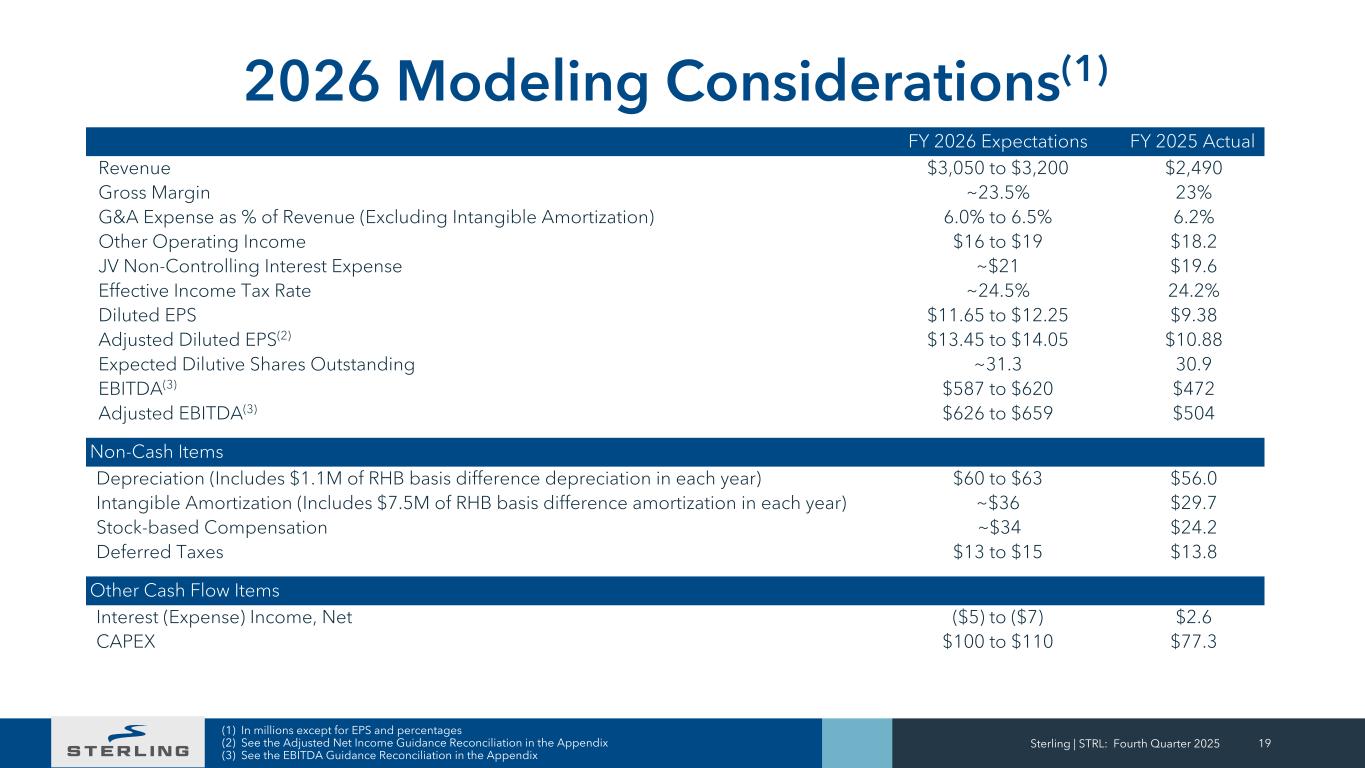 2026 Modeling Considerations(1) Sterling | STRL: Fourth Quarter 2025 19 (1) In millions except for EPS and percentages (2) See the Adjusted Net Income Guidance Reconciliation in the Appendix (3) See the EBITDA Guidance Reconciliation in the Appendix FY 2026 Expectations FY 2025 Actual Revenue $3,050 to $3,200 $2,490 Gross Margin ~23.5% 23% G&A Expense as % of Revenue (Excluding Intangible Amortization) 6.0% to 6.5% 6.2% Other Operating Income $16 to $19 $18.2 JV Non-Controlling Interest Expense ~$21 $19.6 Effective Income Tax Rate ~24.5% 24.2% Diluted EPS $11.65 to $12.25 $9.38 Adjusted Diluted EPS(2) $13.45 to $14.05 $10.88 Expected Dilutive Shares Outstanding ~31.3 30.9 EBITDA(3) $587 to $620 $472 Adjusted EBITDA(3) $626 to $659 $504 Non-Cash Items Depreciation (Includes $1.1M of RHB basis difference depreciation in each year) $60 to $63 $56.0 Intangible Amortization (Includes $7.5M of RHB basis difference amortization in each year) ~$36 $29.7 Stock-based Compensation ~$34 $24.2 Deferred Taxes $13 to $15 $13.8 Other Cash Flow Items Interest (Expense) Income, Net ($5) to ($7) $2.6 CAPEX $100 to $110 $77.3